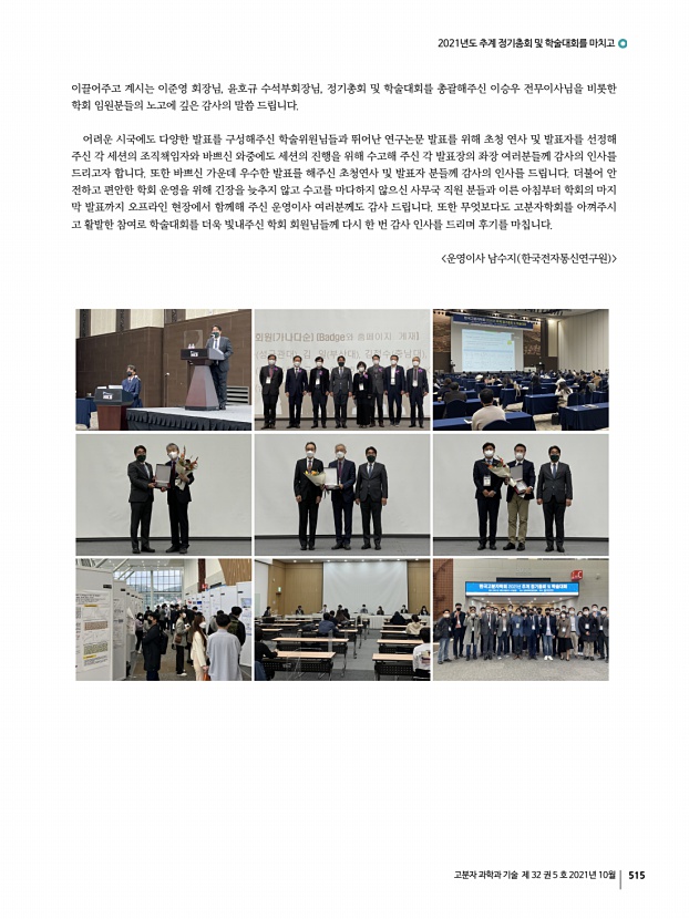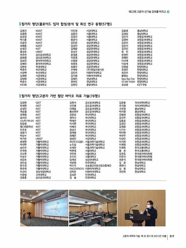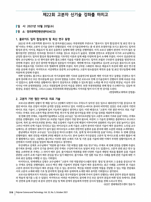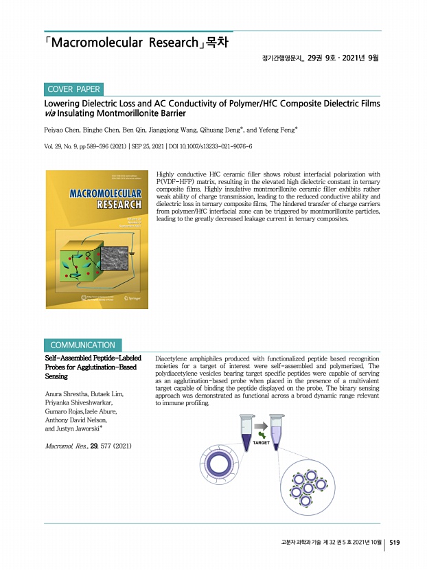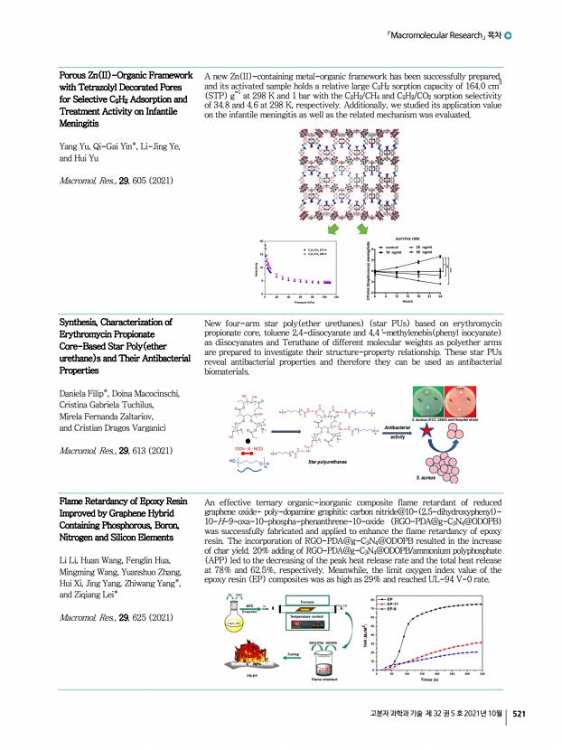 「Macromolecular Research」 목차 고분자 과학과 기술 제 32 권 5 호 2021년 10월 521 Porous Zn II -Organic Framework with Tetrazolyl Decorated Pores for Selective C2H2 Adsorption and Treatment Activity on Infantile Meningitis Yang Yu, Qi-Gai Yin*, Li-Jing Ye, and Hui Yu Macromol. Res., 29, 605 2021 A new Zn II -containing metal-organic framework has been successfully prepared, and its activated sample holds a relative large C2H2 sorption capacity of 164.0 cm3 STP g-1 at 298 K and 1 bar with the C2H2/CH4 and C2H2/CO2 sorption selectivity of 34.8 and 4.6 at 298 K, respectively. Additionally, we studied its application value on the infantile meningitis as well as the related mechanism was evaluated. Synthesis, Characterization of Erythromycin Propionate Core-Based Star Poly ether urethane s and Their Antibacterial Properties Daniela Filip*, Doina Macocinschi, Cristina Gabriela Tuchilus, Mirela Fernanda Zaltariov, and Cristian Dragos Varganici Macromol. Res., 29, 613 2021 New...
