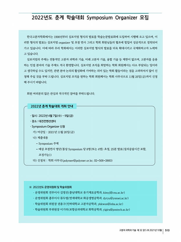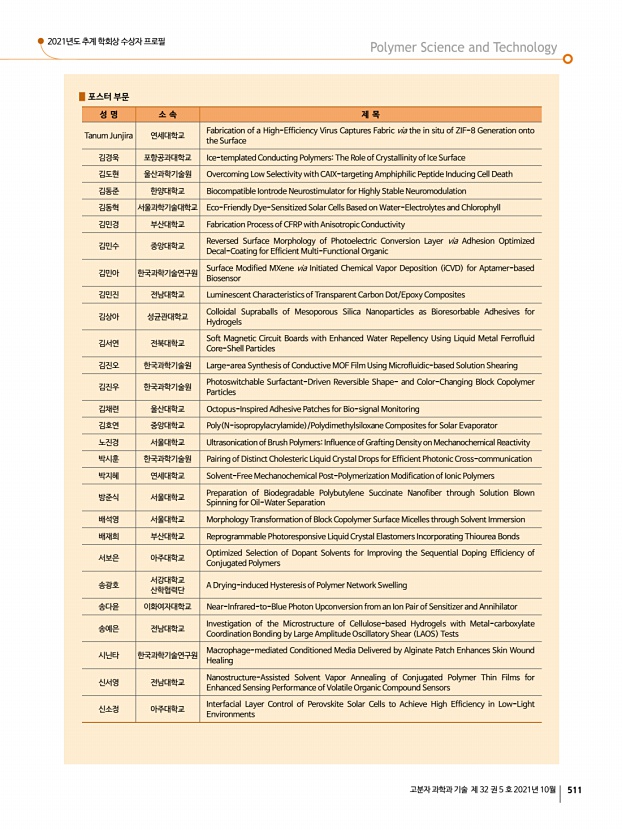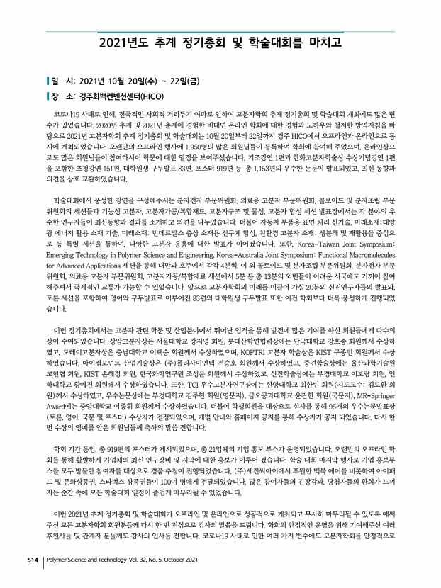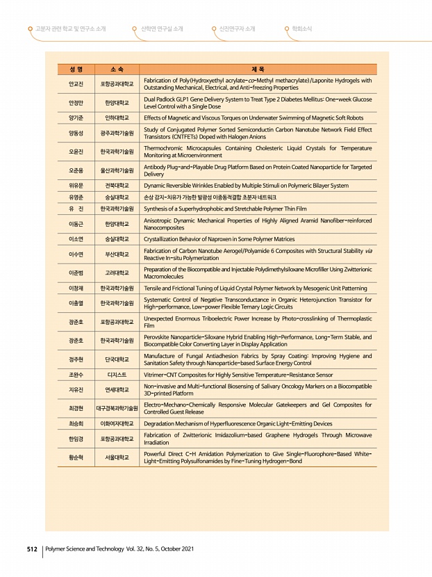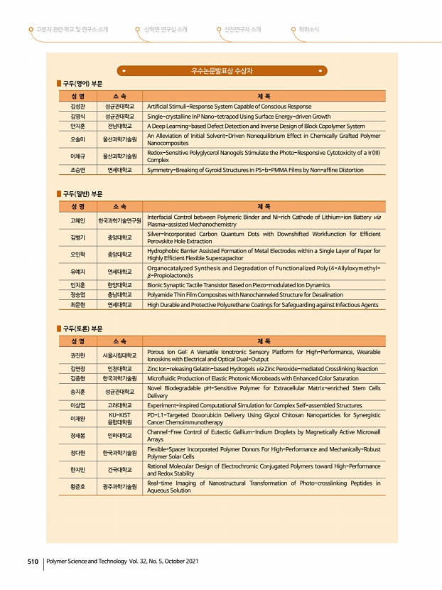 ...신 회원들에게 다수의 상이 수여되었습니다. 상암고분자상은 서울대학교 장지영 회원, 롯데산학연협력상에는 단국대학교 강호종 회원께서 수상하 였고, 도레이고분자상은 충남대학교 이택승 회원께서 수상하였으며, KOPTRI 고분자 학술상은 KIST 구종민 회원께서 수상 하였습니다. 아이컴포넌트 산업기술상은 주 폴리사이언텍 전승호 회원께서 수상하였고, 중견학술상에는 울산과학기술원 고현협 회원, KIST 손해정 회원, 한국화학연구원 조성윤 회원께서 수상하였고, 신진학술상에는 부경대학교 이보람 회원, 인 하대학교 황예진 회원께서 수상하였습니다. 또한, TCI 우수고분자연구상에는 한양대학교 최한빈 회원 지도교수김도환 회 원 께서 수상하였고, 우수논문상에는 부경대학교 김주현 회원 영문지 , 금오공과대학교 윤관한 회원 국문지 , MR-Springer Awa...