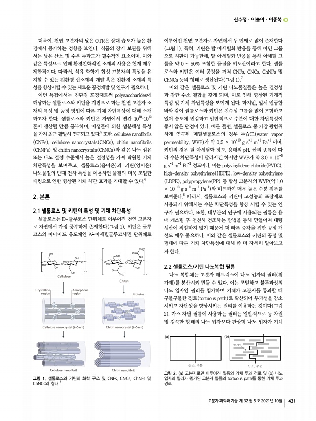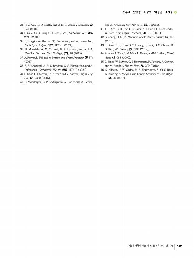 권영제ㆍ손민영ㆍ조상호ㆍ백경열ㆍ조계용 고분자 과학과 기술 제 32 권 5 호 2021년 10월 429 33. R. C. Goy, D. D. Britto, and O. B. G. Assis, Polimeros, 19, 241 2009 34. L. Qi, Z. Xu, X. Jiang, C Hu, and X. Zou, Carbohydr. Res., 334, 2693 2004 35. P. Kongkaoropthamab, T. Piroonpanb, and W. Pasanphan, Carbohydr. Polym., 257, 117610 2021 36. H. Moustafa, A. M. Youssef, N. A. Darwish, and A. I. A. Kandila, Compos. Part BEngi., 172, 16 2019 37. A. Ferrer, L. Pal, and M. Hubbe, Ind. Crops Products, 95, 574 2017 38. S. S. Ahankari, A. R. Subhedara, S. S. Bhadauriaa, and A. Dufresneb, Carbohydr. Ploym., 255, 117479 2021 39. P. Dhar, U. Bhardwaj, A. Kumar, and V. Katiyar, Polym. Eng. Sci., 55, 2388 2015 40. G. Mondragon, C. P. Rodrigueza, A. Gonzalezb, A. Eceiza, and A. Arbelaiza Eur. Polym. J., 62, 1 2015 41. J. H. Yeo, C. H. Lee, C. S. Park, K. J. Lee J. D. Nam, and S. W. Kim, Adv. Polym. Technol., 20, 191 2001 42. G. Zhang, H. Xu, K. Maclnnis, and E. Baer. Polymer...