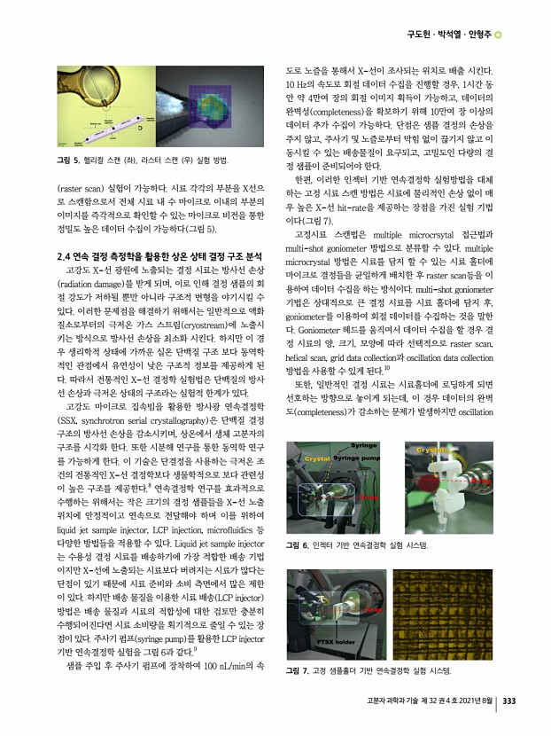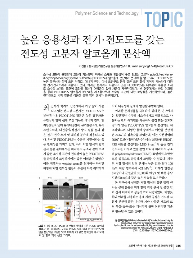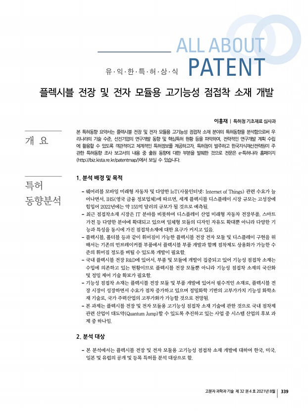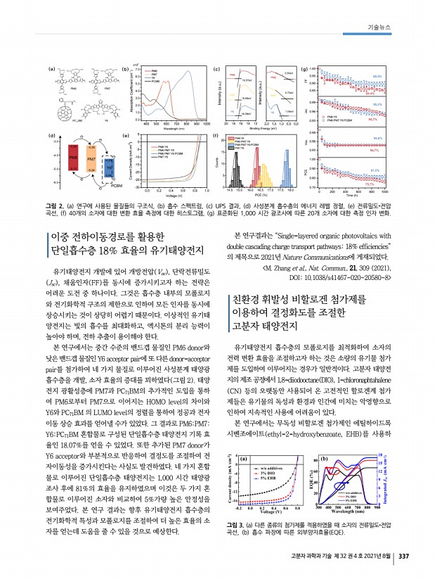 고분자 과학과 기술 제 32 권 4 호 2021년 8월 337 그림 2. a 연구에 사용된 물질들의 구조식, b 흡수 스펙트럼, c UPS 결과, d 사성분계 흡수층의 에너지 레벨 정렬, e 전류밀도-전압 곡선, f 40개의 소자에 대한 변환 효율 측정에 대한 히스토그램, g 표준화된 1,000 시간 광조사에 따른 20개 소자에 대한 측정 인자 변화. 그림 3. a 다른 종류의 첨가제를 적용하였을 때 소자의 전류밀도-전압 곡선, b 흡수 파장에 따른 외부양자효율 EQE 이중 전하이동경로를 활용한 단일흡수층 18% 효율의 유기태양전지 유기태양전지 개발에 있어 개방전압 Voc , 단락전류밀도 Jsc , 채움인자 FF 를 동시에 증가시키고자 하는 전략은 어려운 도전 중 하나이다. 그것은 흡수층 내부의 모폴로지 와 전기화학적 구조의 제한으로 인하여 모든 인자를 동시에 상승시키는 것이 상당히 어렵기 때문이...
