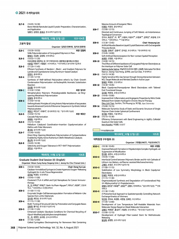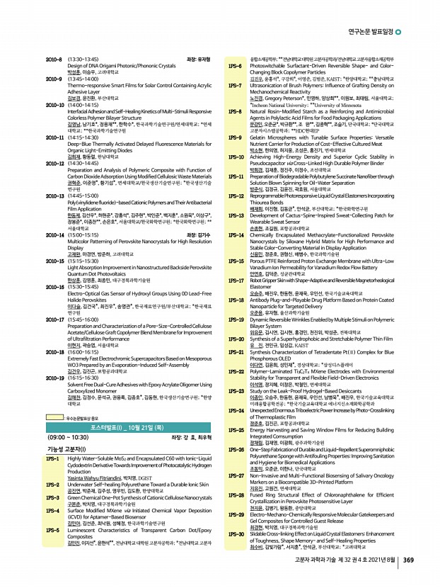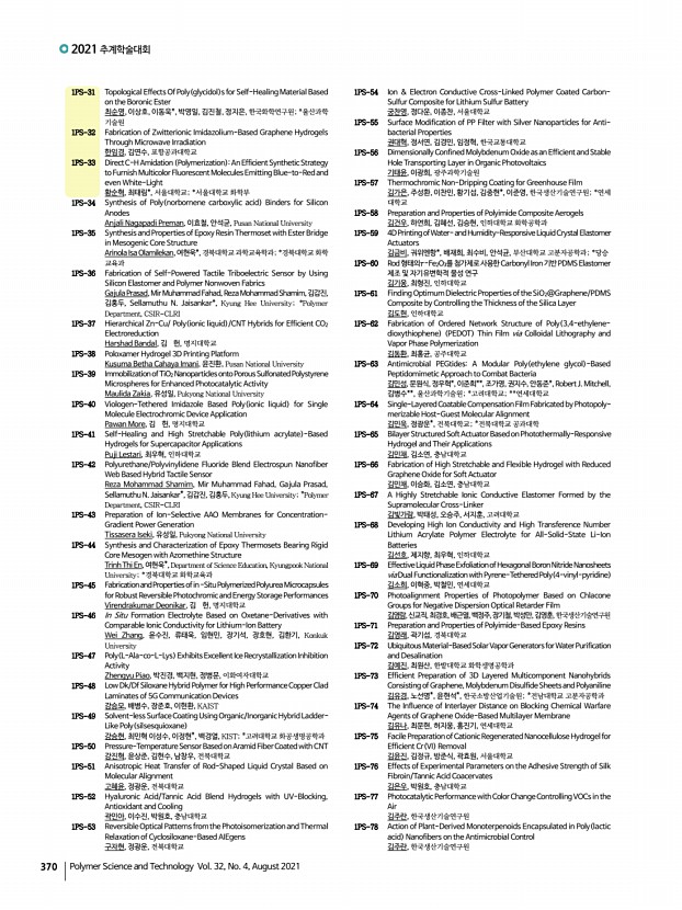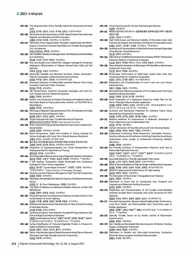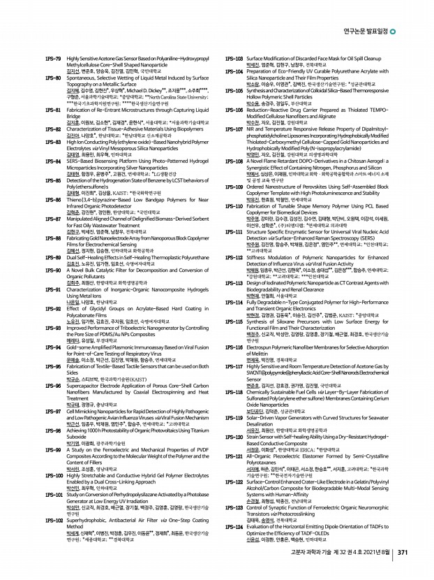 연구논문 발표일정 고분자 과학과 기술 제 32 권 4 호 2021년 8월 371 1PS-79 Highly Sensitive Acetone Gas Sensor Based on Polyaniline-Hydroxypropyl Methylcellulose Core-Shell Shaped Nanoparticle 김지선, 변준호, 양승욱, 김진열, 김민혁, 국민대학교 1PS-80 Spontaneous, Selective Wetting of Liquid Metal Induced by Surface Topography on a Metallic Surface 김지혜, 김수영, 김현진*, 우상혁*, Michael D. Dickey**, 조지웅***, 소주희****, 구형준,서울과학기술대학교; *중앙대학교; **North Carolina State University; ***한국기초과학지원연구원; ****한국생산기술연구원 1PS-81 Fabrication of Re-Entrant Microstructures through Capturing Liquid Bridge 김지훈, 이원보, 김소현*, 김재경*, 윤현식*, 서울대학교; *서울과학기술대학교 1PS-82 Characterization of Tissue-Adhesive Materials Using Biopolymers 김진아, 나양호*, 한남대학교; *한남대학교 신소재공학과 1PS-83 High Ion Condu...