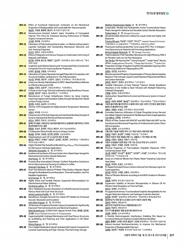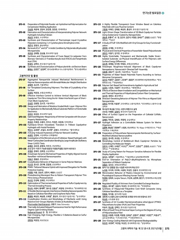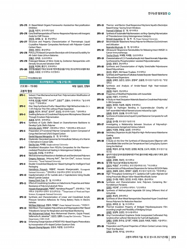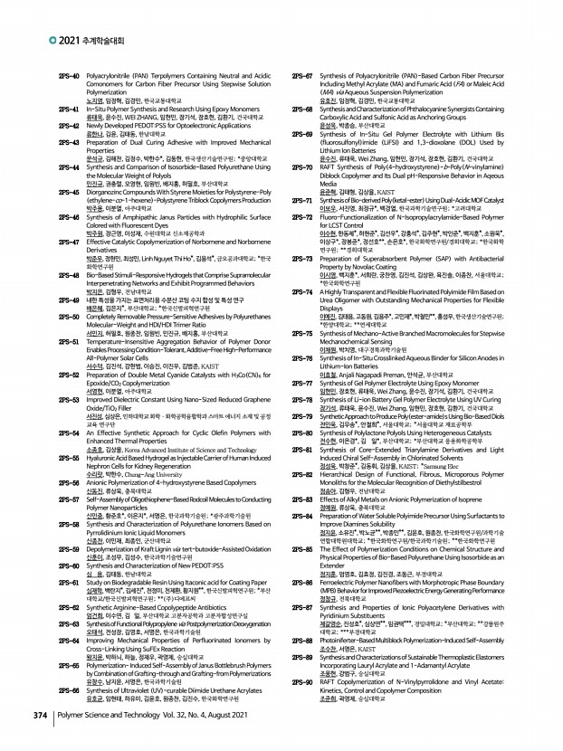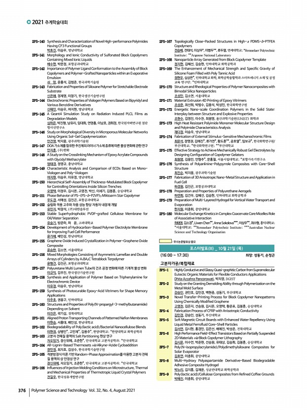 ..., No. 4, August 2021 2PS-140 Synthesis and Characterization of Novel High-performance Polyimides Having CF3 Functional Groups 박효진, 이승우, 영남대학교 2PS-141 Morphology and Ionic Conductivity of Sulfonated Block Copolymers Containing Mixed Ionic Liquids 배수현, 박문정, 포항공과대학교 2PS-142 Importance of Polymer Ligand Conformation to the Assembly of Block Copolymers and Polymer-Grafted Nanoparticles within an Evaporative Emulsion 쉬 멍, 윤홍석, 김범준, 한국과학기술원 2PS-143 Fabrication and Properties of Siloxane Polymer for Stretchable Electrode Substrate 신은애, 정제영, 이창기, 한국생산기술연구원 2PS-144 Electrochromic Properties of Viologen Polymers Based on Bipyridyl and Various Benzidine Derivatives 신해인, 이승우, 여지현, 영남대학교 2PS-145 A Geant4 Simulation Study on Radiation Induced PLCL Films as Degradation Models 심하은, 박진형, 남유리, 임대희, 연영흠, 이남호, 권희정, 한국원...