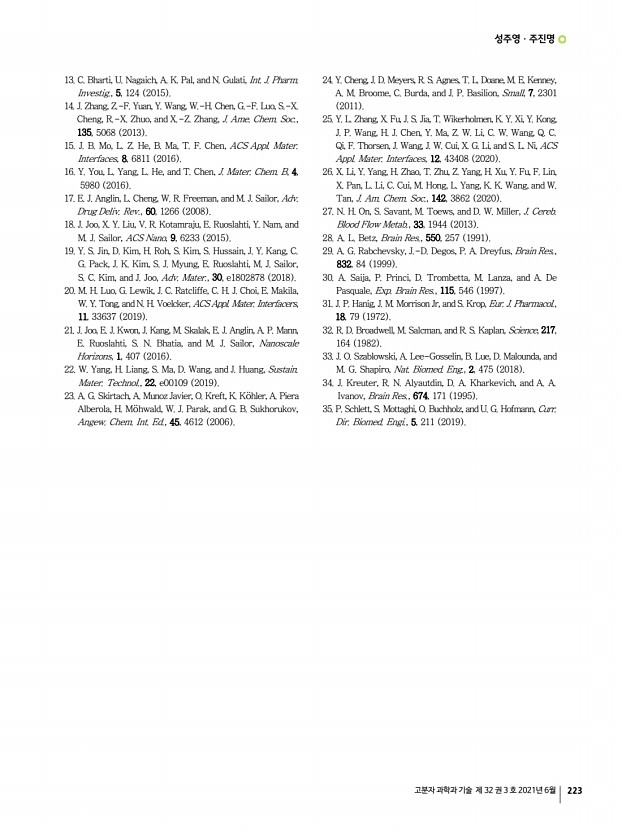 성주영ㆍ주진명 고분자 과학과 기술 제 32 권 3 호 2021년 6월 223 13. C. Bharti, U. Nagaich, A. K. Pal, and N. Gulati, Int. J. Pharm. Investig., 5, 124 2015 14. J. Zhang, Z.-F. Yuan, Y. Wang, W.-H. Chen, G.-F. Luo, S.-X. Cheng, R.-X. Zhuo, and X.-Z. Zhang, J. Ame. Chem. Soc., 135, 5068 2013 15. J. B. Mo, L. Z. He, B. Ma, T. F. Chen, ACS Appl. Mater. Interfaces, 8, 6811 2016 16. Y. You, L. Yang, L. He, and T. Chen, J. Mater. Chem. B, 4, 5980 2016 17. E. J. Anglin, L. Cheng, W. R. Freeman, and M. J. Sailor, Adv. Drug Deliv. Rev., 60, 1266 2008 18. J. Joo, X. Y. Liu, V. R. Kotamraju, E. Ruoslahti, Y. Nam, and M. J. Sailor, ACS Nano, 9, 6233 2015 19. Y. S. Jin, D. Kim, H. Roh, S. Kim, S. Hussain, J. Y. Kang, C. G. Pack, J. K. Kim, S. J. Myung, E. Ruoslahti, M. J. Sailor, S. C. Kim, and J. Joo, Adv. Mater., 30, e1802878 2018 20. M. H. Luo, G. Lewik, J. C. Ratcliffe, C. H. J. Choi, E. Makila, W. Y. Tong, and N. H. Voelcker, ACS Appl. Mater. Interfacers, 11, 33637 2019 21. J....
