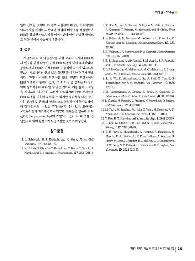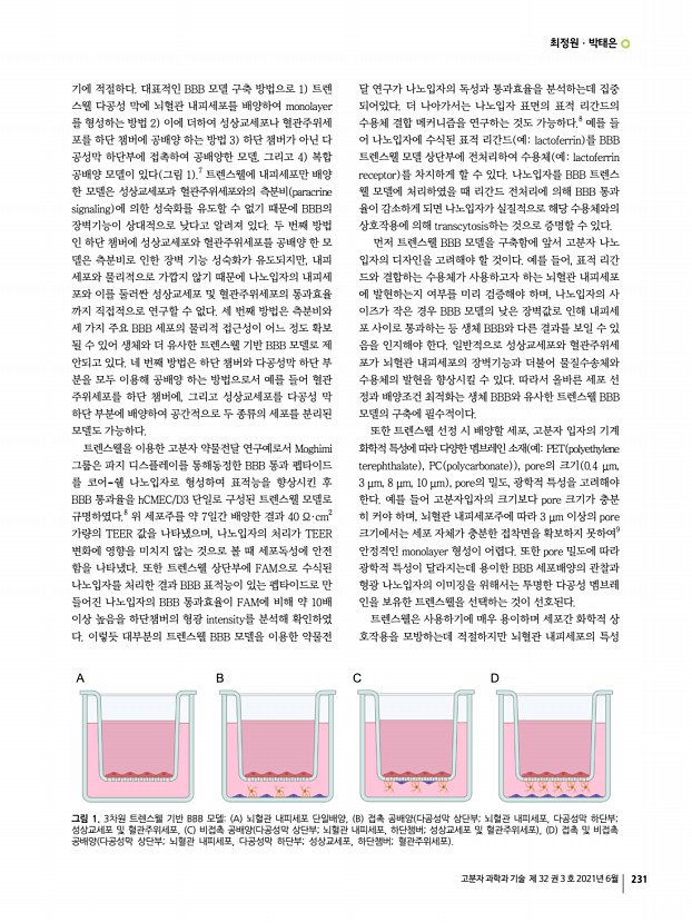 최정원ㆍ박태은 고분자 과학과 기술 제 32 권 3 호 2021년 6월 231 그림 1. 3차원 트렌스웰 기반 BBB 모델A 뇌혈관 내피세포 단일배양, B 접촉 공배양 다공성막 상단부; 뇌혈관 내피세포, 다공성막 하단부; 성상교세포 및 혈관주위세포, C 비접촉 공배양 다공성막 상단부; 뇌혈관 내피세포, 하단챔버; 성상교세포 및 혈관주위세포 , D 접촉 및 비접촉 공배양 다공성막 상단부; 뇌혈관 내피세포, 다공성막 하단부; 성상교세포, 하단챔버; 혈관주위세포 기에 적절하다. 대표적인 BBB 모델 구축 방법으로 1 트렌 스웰 다공성 막에 뇌혈관 내피세포를 배양하여 monolayer 를 형성하는 방법 2 이에 더하여 성상교세포나 혈관주위세 포를 하단 챔버에 공배양 하는 방법 3 하단 챔버가 아닌 다 공성막 하단부에 접촉하여 공배양한 모델, 그리고 4 복합 공배양 모델이 있다 그림 1 .7 ...