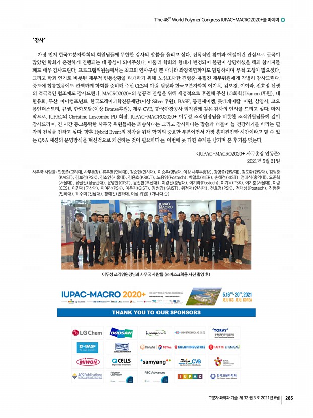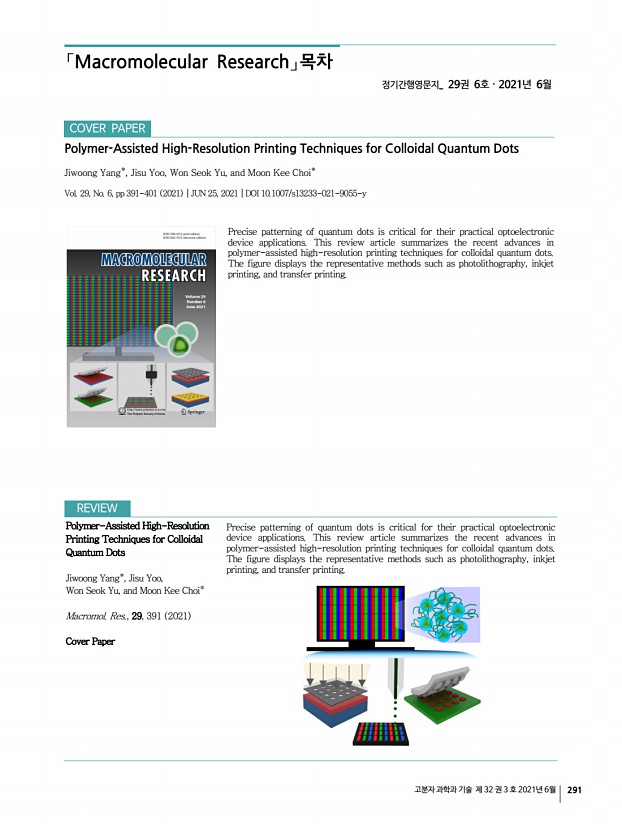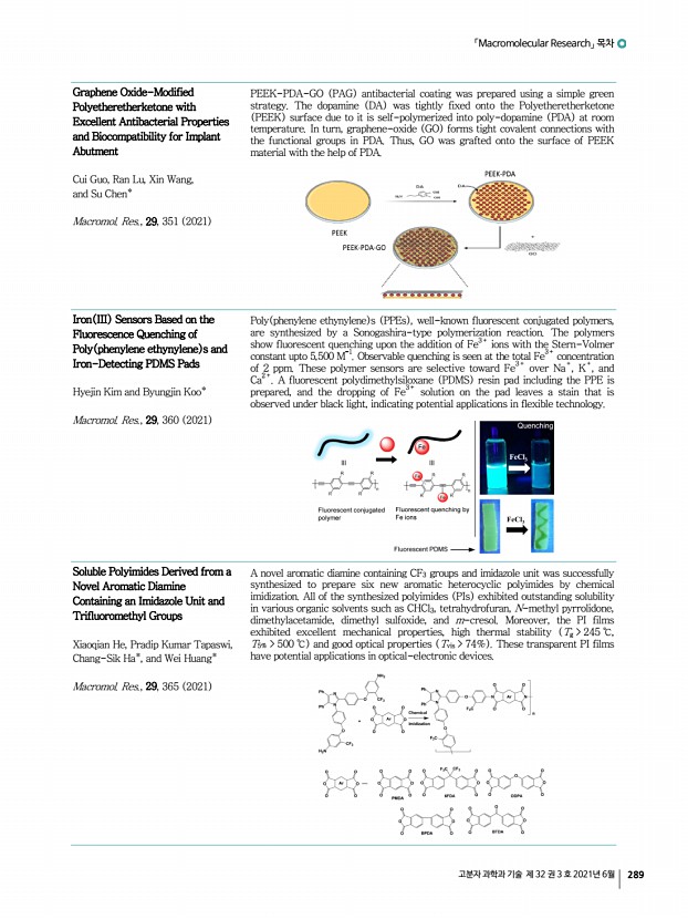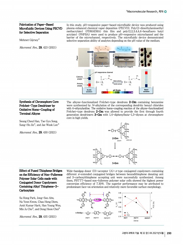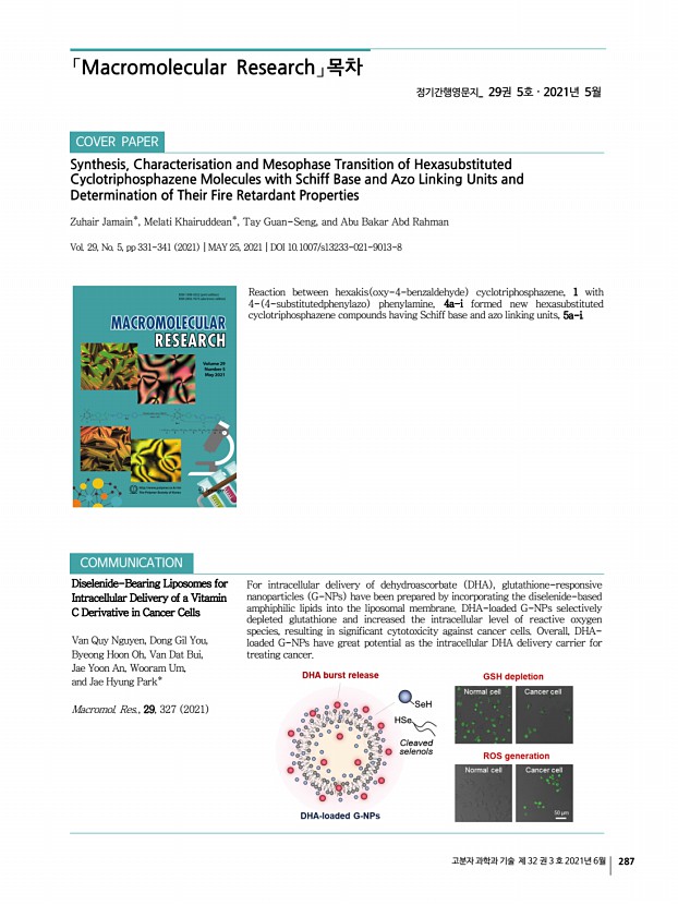 고분자 과학과 기술 제 32 권 3 호 2021년 6월 287 「Macromolecular Research」목차 정기간행영문지_ 29권 5호 · 2021년 5월 Reaction between hexakis oxy-4-benzaldehyde cyclotriphosphazene, 1 with 4- 4-substitutedphenylazo phenylamine, 4a-i formed new hexasubstituted cyclotriphosphazene compounds having Schiff base and azo linking units, 5a-i. COVER PAPER Synthesis, Characterisation and Mesophase Transition of Hexasubstituted Cyclotriphosphazene Molecules with Schiff Base and Azo Linking Units and Determination of Their Fire Retardant Properties Zuhair Jamain*, Melati Khairuddean*, Tay Guan-Seng, and Abu Bakar Abd Rahman Vol. 29, No. 5, pp 331-341 2021 │MAY 25, 2021│DOI 10.1007/s13233-021-9013-8 COMMUNICATION Diselenide-Bearing Liposomes for Intracellular Delivery of a Vitamin C Derivative in Cancer Cells Van Quy Nguyen, Dong Gil You, Byeong Hoon Oh, Van Dat Bui, Jae Yoon An, Wooram Um, and Jae Hyung Park* Macromol. Res., 29, 327 2021 For intracellular deliver...