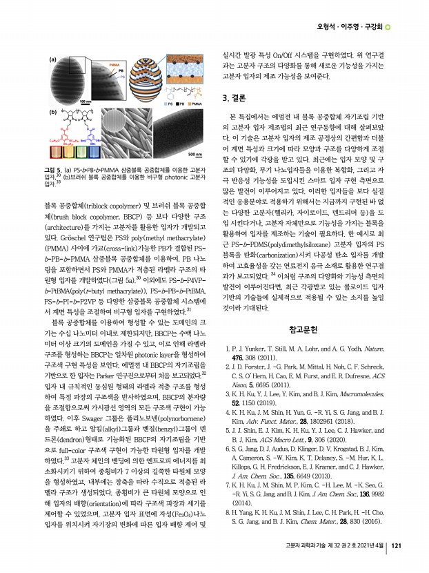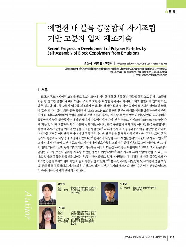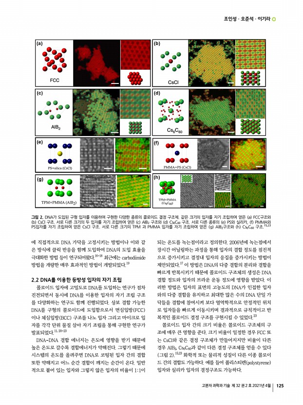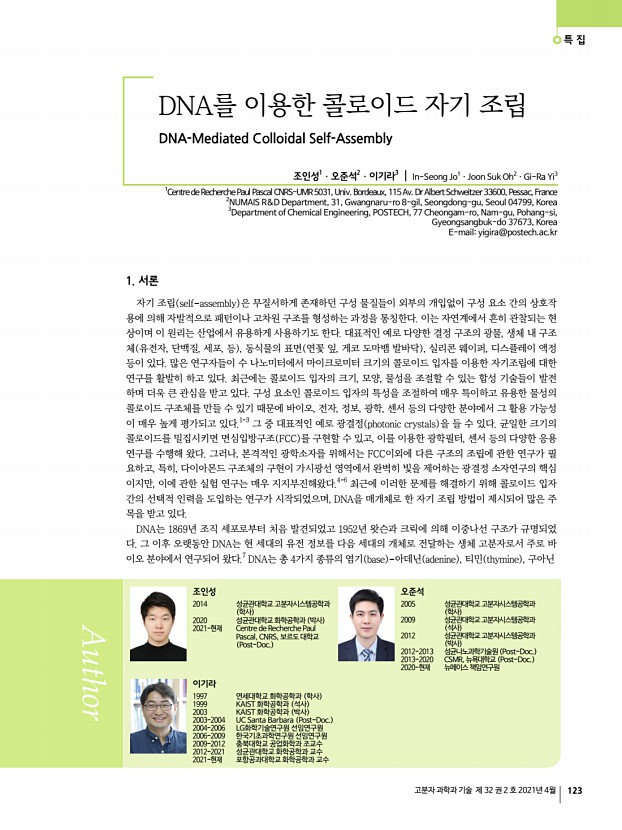 특 집 고분자 과학과 기술 제 32 권 2 호 2021년 4월 123 DNA를 이용한 콜로이드 자기 조립 DNA-Mediated Colloidal Self-Assembly 조인성1ㆍ오준석2ㆍ이기라3 | In-Seong Jo1ㆍJoon Suk Oh2ㆍGi-Ra Yi3 1Centre de Recherche Paul Pascal CNRS-UMR 5031, Univ. Bordeaux, 115 Av. Dr Albert Schweitzer 33600, Pessac, France 2NUMAIS R&D Department, 31, Gwangnaru-ro 8-gil, Seongdong-gu, Seoul 04799, Korea 3Department of Chemical Engineering, POSTECH, 77 Cheongam-ro, Nam-gu, Pohang-si, Gyeongsangbuk-do 37673, Korea E-mailyigira@postech.ac.kr 조인성 2014 성균관대학교 고분자시스템공학과 학사 2020 성균관대학교 화학공학과 박사 2021-현재 Centre de Recherche Paul Pascal, CNRS, 보르도 대학교 Post-Doc. 오준석 2005 성균관대학교 고분자시스템공학과 학사 2009 성균관대학교 고분자시스템공학과 석사 2012 성균관대학교 고분자시스템공학과 박사 2012-2013 성균나노과학기술원 Post-Doc. 2013-...