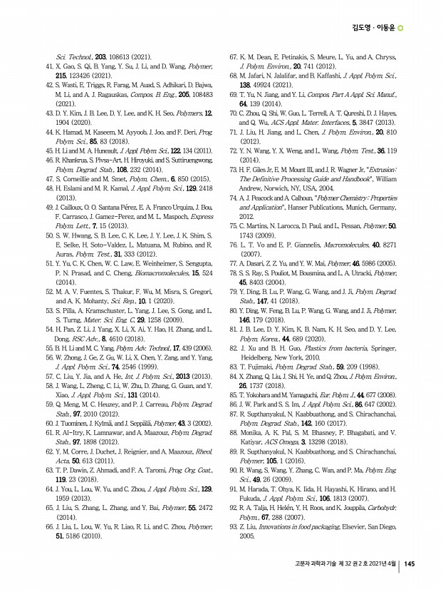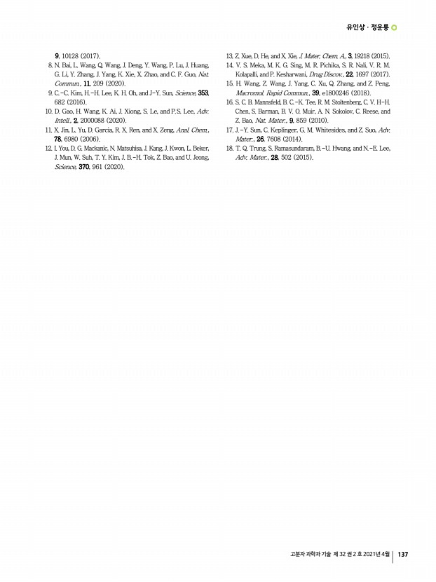 유인상ㆍ정운룡 고분자 과학과 기술 제 32 권 2 호 2021년 4월 137 9, 10128 2017 8. N. Bai, L. Wang, Q. Wang, J. Deng, Y. Wang, P. Lu, J. Huang, G. Li, Y. Zhang, J. Yang, K. Xie, X. Zhao, and C. F. Guo, Nat. Commun., 11, 209 2020 9. C.-C. Kim, H.-H. Lee, K. H. Oh, and J-Y. Sun, Science, 353, 682 2016 10. D. Gao, H. Wang, K. Ai, J. Xiong, S. Le, and P.S. Lee, Adv. Intell., 2, 2000088 2020 11. X. Jin, L. Yu, D. Garcia, R. X. Ren, and X. Zeng, Anal. Chem., 78, 6980 2006 12. I. You, D. G. Mackanic, N. Matsuhisa, J. Kang, J. Kwon, L. Beker, J. Mun, W. Suh, T. Y. Kim, J. B.-H. Tok, Z. Bao, and U. Jeong, Science, 370, 961 2020 13. Z. Xue, D. He, and X. Xie, J. Mater. Chem. A., 3, 19218 2015 14. V. S. Meka, M. K. G. Sing, M. R. Pichika, S. R. Nali, V. R. M. Kolapalli, and P. Kesharwani, Drug Discov., 22, 1697 2017 15. H. Wang, Z. Wang, J. Yang, C. Xu, Q. Zhang, and Z. Peng, Macromol. Rapid Commun., 39, e1800246 2018 16. S. C. B. Mannsfeld, B. C.-K. Tee, R. M. Stoltenberg, C. V....
