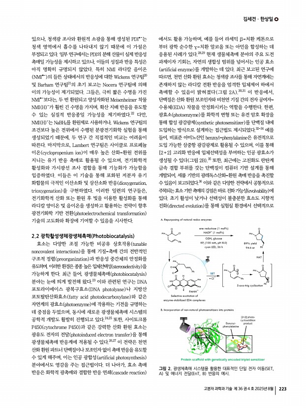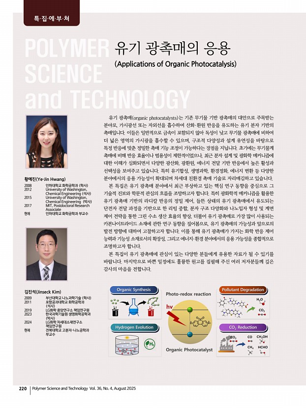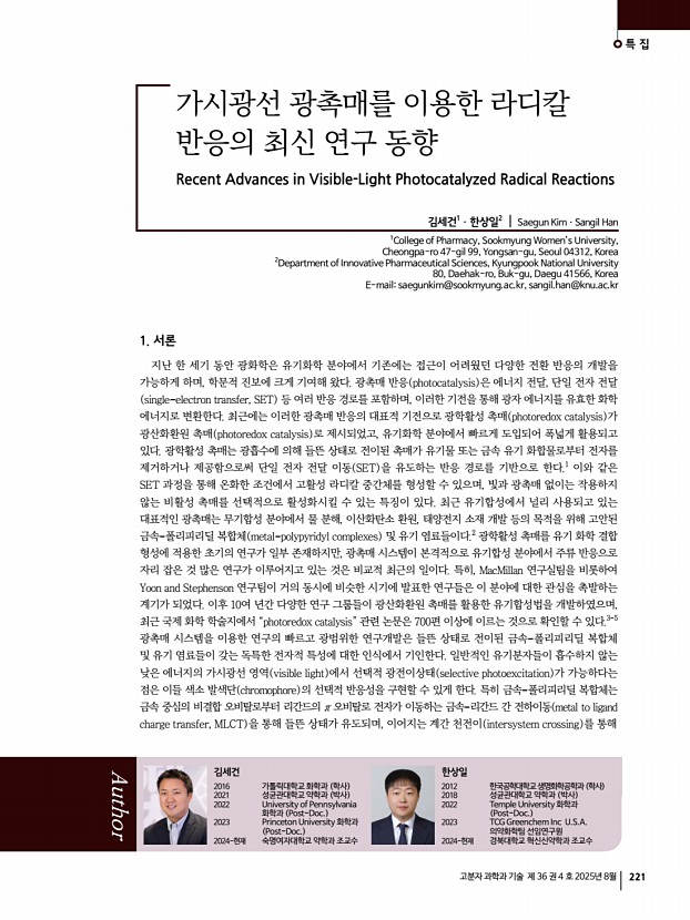 ...으며, 구조적 다양성과 설계 유연성을 바탕으로 특정 반응에 맞춘 정밀한 촉매 기능 조정이 가능하다는 장점을 지닙니다. 초기에는 무기물계 촉매에 비해 반응 효율이나 범용성이 제한적이었으나, 최근 분자 설계 및 광화학 메커니즘에 대한 이해가 심화되면서 다양한 광산화, 광환원, 에너지 전달 기반 반응에서 높은 활성과 선택성을 보여주고 있습니다. 특히 유기합성, 생명과학, 환경정화, 에너지 변환 등 다양한 분야에서의 응용 가능성이 확대되며 차세대 친환경 촉매 기술로 자리매김하고 있습니다. 본 특집은 유기 광촉매 분야에서 최근 부상하고 있는 핵심 연구 동향을 중심으로 그 기술적 진보와 학문적 관심의 흐름을 조망하고자 합니다. 특히 광화학적 메커니즘을 활용한 유기 광촉매 기반의 라디칼 반응의 정밀 제어, 들뜬 상태의 유기 광촉...