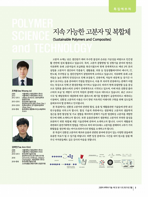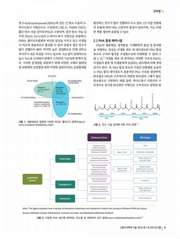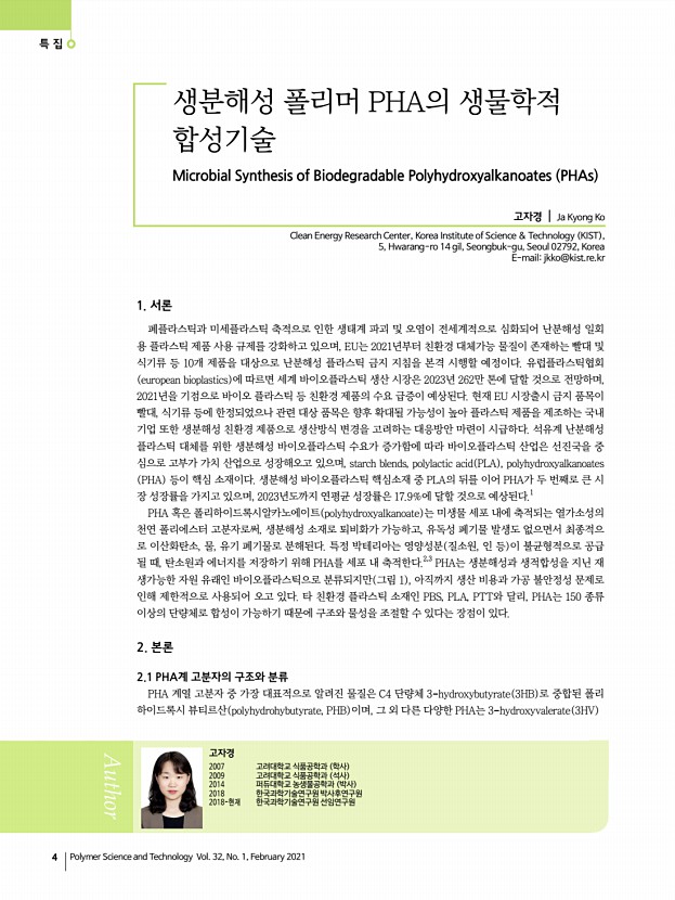 ...e and Technology Vol. 32, No. 1, February 2021 생분해성 폴리머 PHA의 생물학적 합성기술 Microbial Synthesis of Biodegradable Polyhydroxyalkanoates PHAs 고자경 | Ja Kyong Ko Clean Energy Research Center, Korea Institute of Science & Technology KIST , 5, Hwarang-ro 14 gil, Seongbuk-gu, Seoul 02792, Korea E-mailjkko@kist.re.kr 고자경 2007 고려대학교 식품공학과 학사 2009 고려대학교 식품공학과 석사 2014 퍼듀대학교 농생물공학과 박사 2018 한국과학기술연구원 박사후연구원 2018-현재 한국과학기술연구원 선임연구원 1. 서론 폐플라스틱과 미세플라스틱 축적으로 인한 생태계 파괴 및 오염이 전세계적으로 심화되어 난분해성 일회 용 플라스틱 제품 사용 규제를 강화하고 있으며, EU는 2021년부터 친환경 대체가능 물질이 존재하는 빨대 및 식기류 등 10개 제품을 대상으로 난분해성 플라스틱 금지 지침을 본격 시행할 예정...