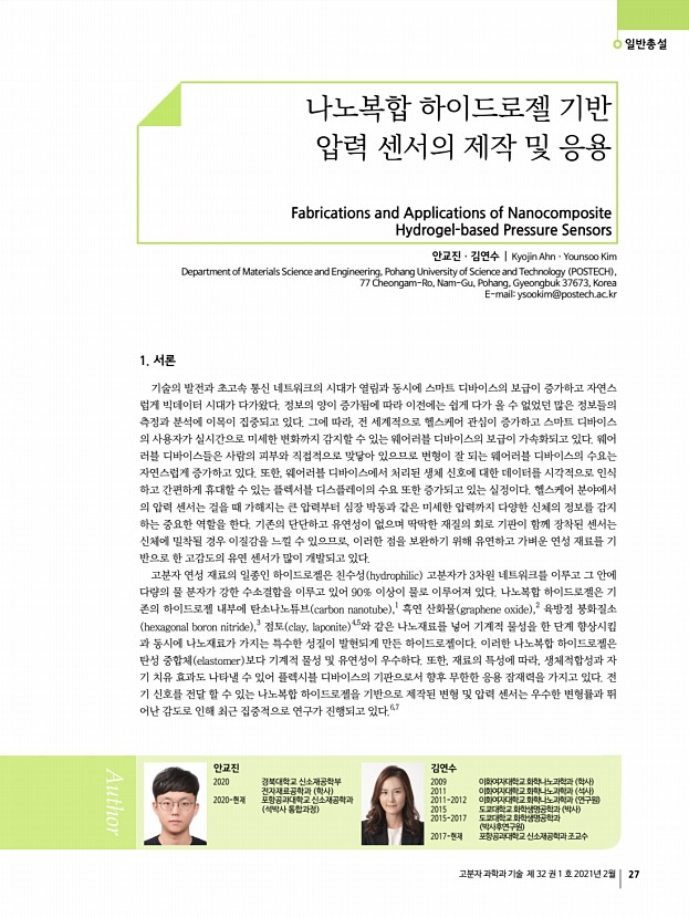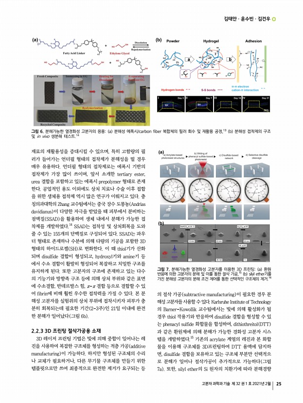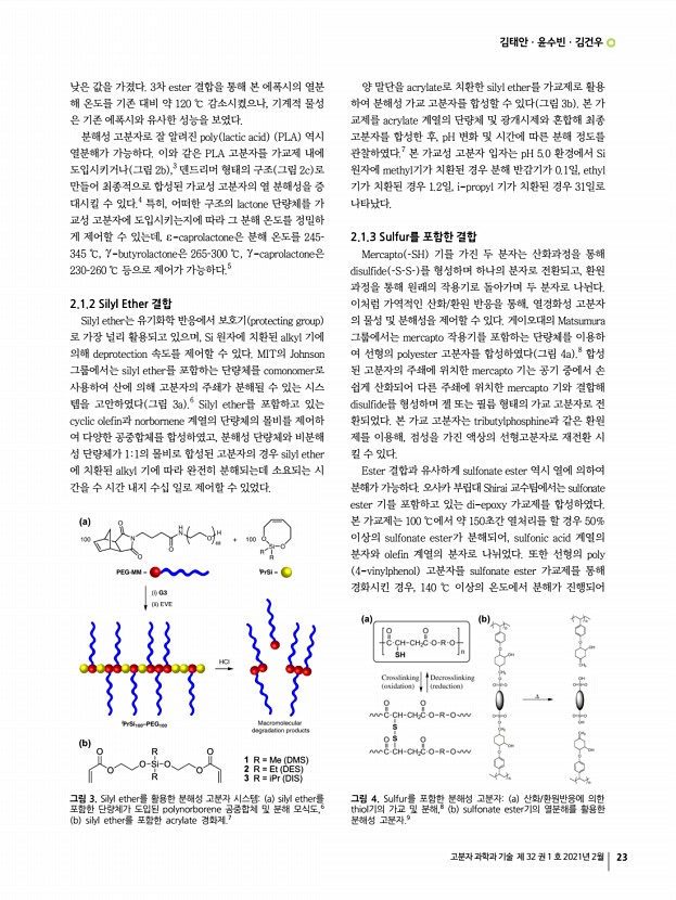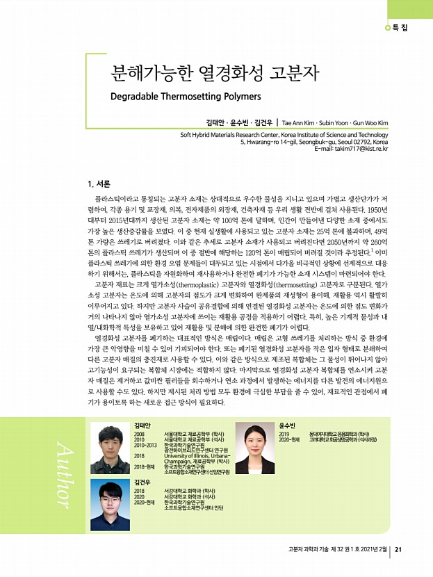 특 집 고분자 과학과 기술 제 32 권 1 호 2021년 2월 21 분해가능한 열경화성 고분자 Degradable Thermosetting Polymers 김태안ㆍ윤수빈ㆍ김건우 | Tae Ann KimㆍSubin YoonㆍGun Woo Kim Soft Hybrid Materials Research Center, Korea Institute of Science and Technology 5, Hwarang-ro 14-gil, Seongbuk-gu, Seoul 02792, Korea E-mailtakim717@kist.re.kr 김태안 2008 서울대학교 재료공학부 학사 2010 서울대학교 재료공학부 석사 2010-2013 한국과학기술연구원 광전하이브리드연구센터 연구원 2018 University of Illinois, UrbanaChampaign, 재료공학부 박사 2018-현재 한국과학기술연구원 소프트융합소재연구센터 선임연구원 윤수빈 2019 동덕여자대학교 응용화학과 학사 2020-현재 고려대학교 화공생명공학과 석사과정 김건우 2018 서강대학교 화학과 학사 2020 서강대학교 화학과 석사 2020-현재 한국과학기술연구원 소프트융합소재연구센터 ...
