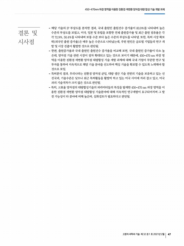 450-470nm 파장 영역을 이용한 친환경 색변환 양자점 대량 합성 기술 개발 과제 고분자 과학과 기술 제 32 권 1 호 2021년 2월 47 결론 및 시사점 해당 기술의 IP 부상도를 분석한 결과, 국내 출원인 출원건수 증가율이 83.0%를 나타내며 높은 수준의 부상도를 보였고, 미국, 일본 및 유럽을 포함한 전체 출원증가율 및 최근 출원 점유율은 각 각 72.9%, 50.4%를 나타내며 보통 수준 보다 높은 수준의 부상도를 나타냄. 또한, 특허 시장 확보 력 외국인 출원 증가율 은 매우 높은 수준으로 나타났는데, 주된 원인은 글로벌 기업들의 연구 개 발 및 시장 진출이 활발한 것으로 판단됨. 한편, 출원증가율과 국내 출원인 출원건수 증가율을 비교해 보면, 국내 출원인 증가율이 다소 높 은데, 양자점 기술 관련 시장이 점차 확대되고 있는 것으로 보이기 때문에, 450-470 nm 파장 영 ...