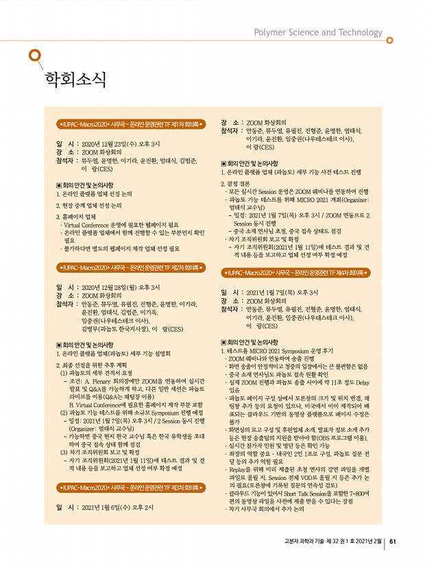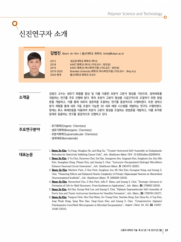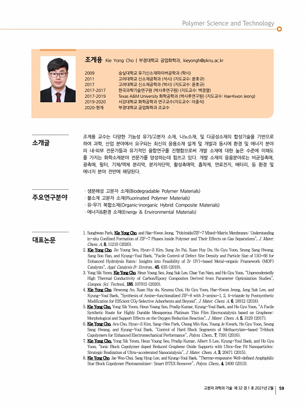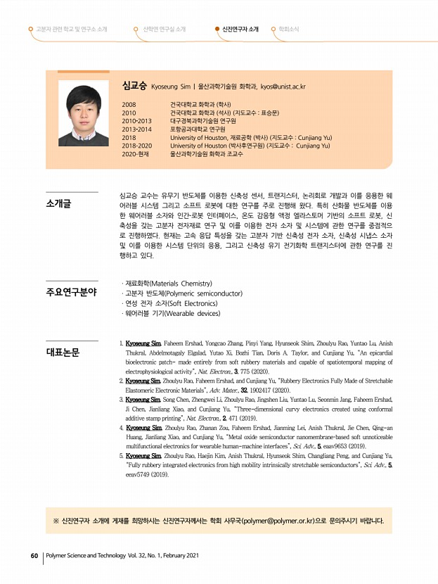 고분자 관련 학교 및 연구소 소개 산학연 연구실 소개 신진연구자 소개 학회소식 60 Polymer Science and Technology Vol. 32, No. 1, February 2021 심교승 Kyoseung Sim | 울산과학기술원 화학과, kyos@unist.ac.kr 2008 건국대학교 화학과 학사 2010 건국대학교 화학과 석사 지도교수 표승문 2010-2013 대구경북과학기술원 연구원 2013-2014 포항공과대학교 연구원 2018 University of Houston, 재료공학 박사 지도교수 Cunjiang Yu 2018–2020 University of Houston 박사후연구원 지도교수 Cunjiang Yu 2020–현재 울산과학기술원 화학과 조교수 심교승 교수는 유무기 반도체를 이용한 신축성 센서, 트랜지스터, 논리회로 개발과 이를 응용한 웨 어러블 시스템 그리고 소프트 로봇에 대한 연구를 주로 진행해 왔다. 특히 산화물 반도체를 이용 한 웨어러블 소자와 인간-로봇 인터페이스, 온도 감응형 액정 엘라스토...