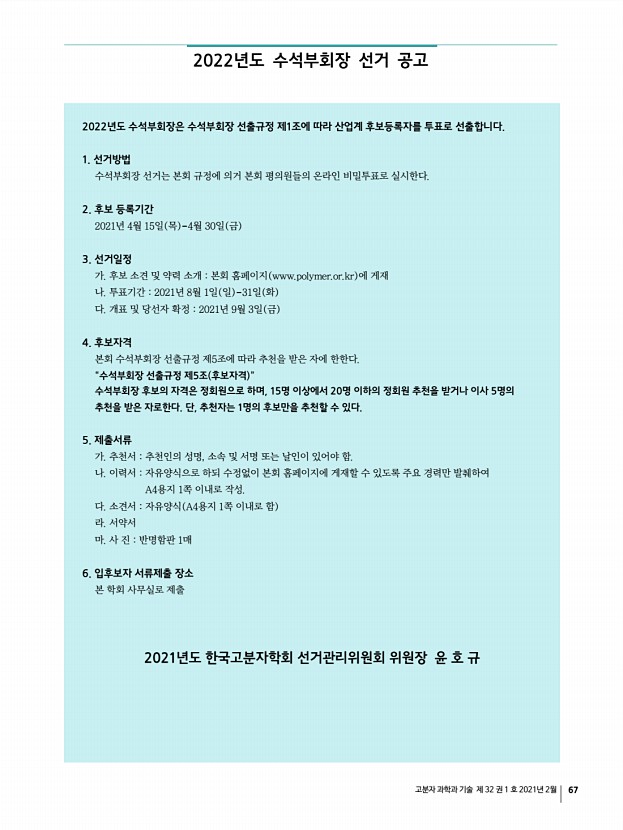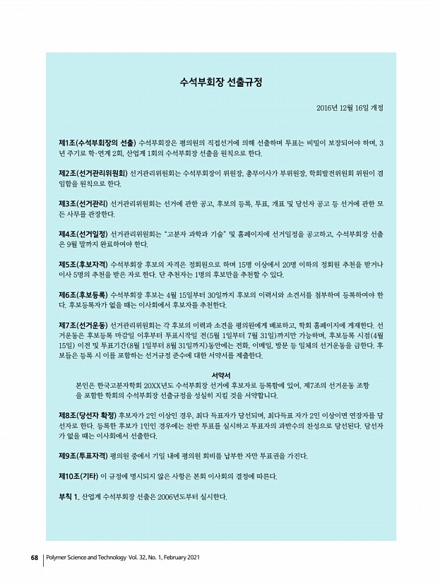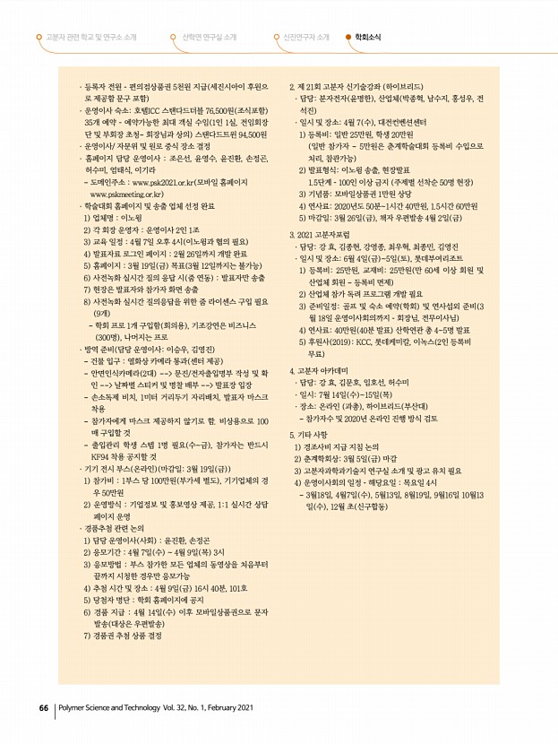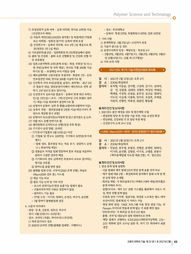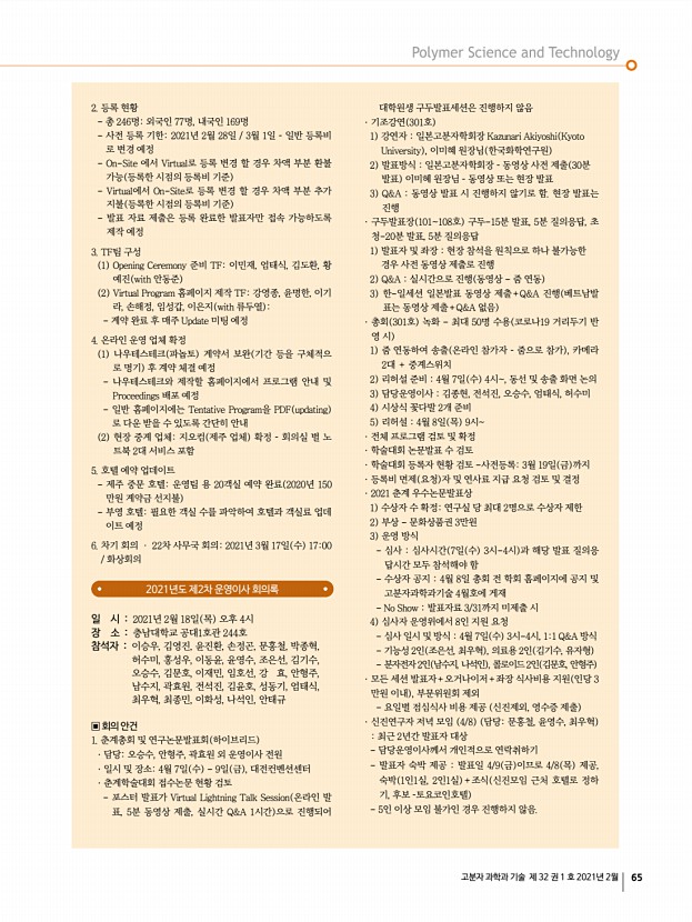 ...회의까지 – 회장님, 전무이사님 4 연사료40만원 40분 발표 산학연관 총 45명 발표 5 후원사 2019 KCC, 롯데케미칼, 이녹스 2인 등록비 무료 4. 고분자 아카데미 · 담당강 효, 김문호, 임호선, 허수미 · 일시7월 14일 수 15일 목 · 장소온라인 과총 , 하이브리드 부산대 참가자수 및 2020년 온라인 진행 방식 검토 5. 기타 사항 1 경조사비 지급 지침 논의 2 춘계학회상3월 5일 금 마감 3 고분자과학과기술지 연구실 소개 및 광고 유치 필요 4 운영이사회의 일정 – 해당요일 목요일 4시 3월18일, 4월7일 수 , 5월13일, 8월19일, 9월16일 10월13 일 수 , 12월 초 신구합동