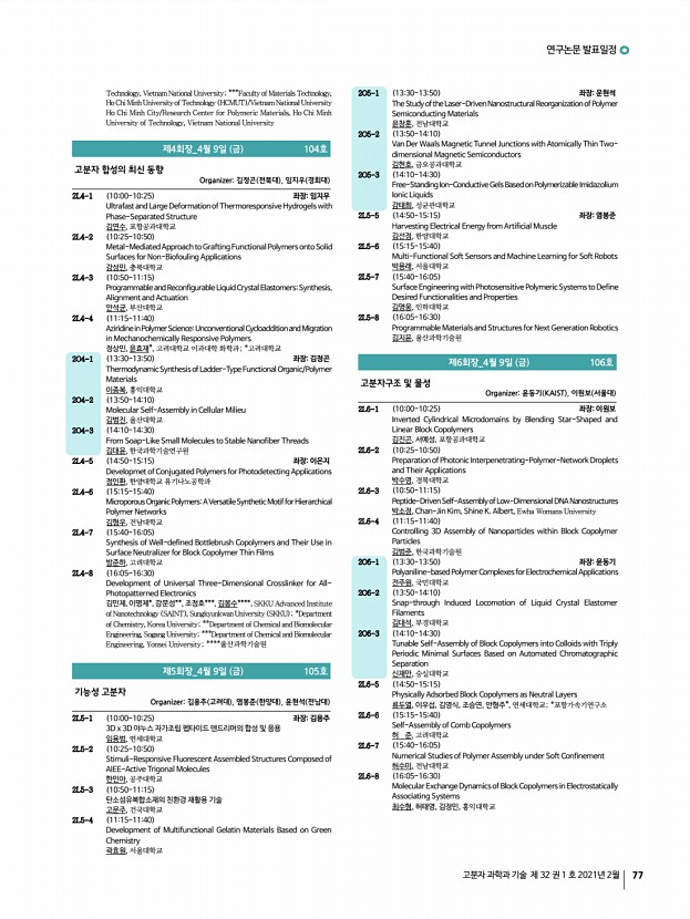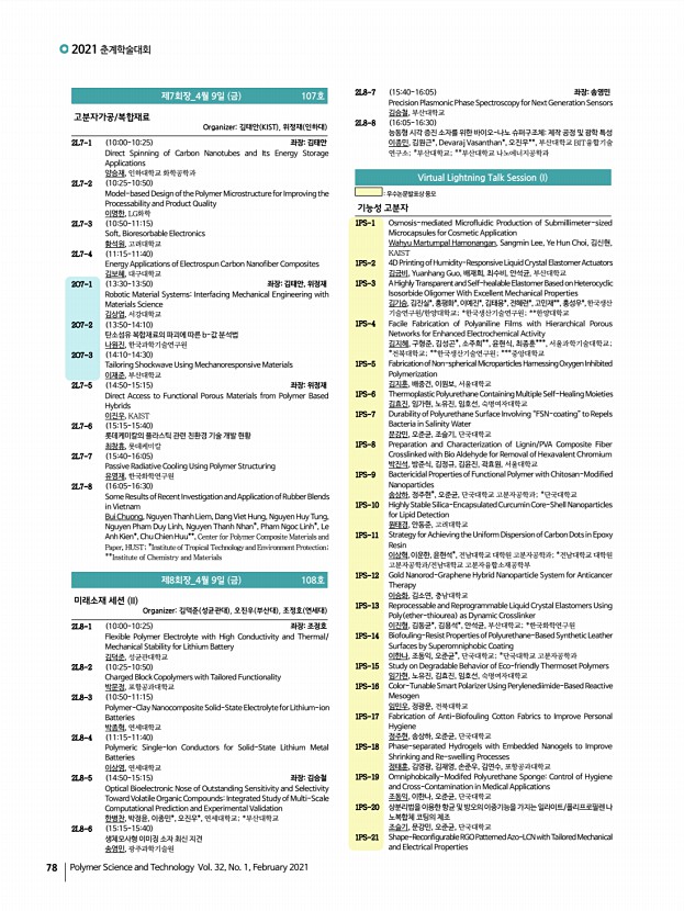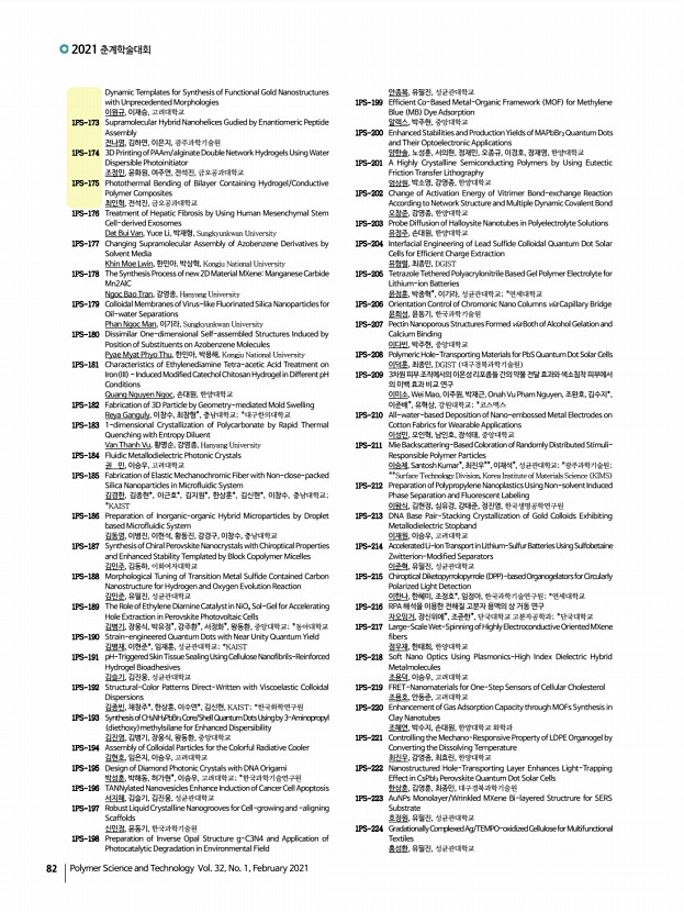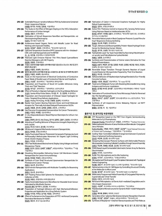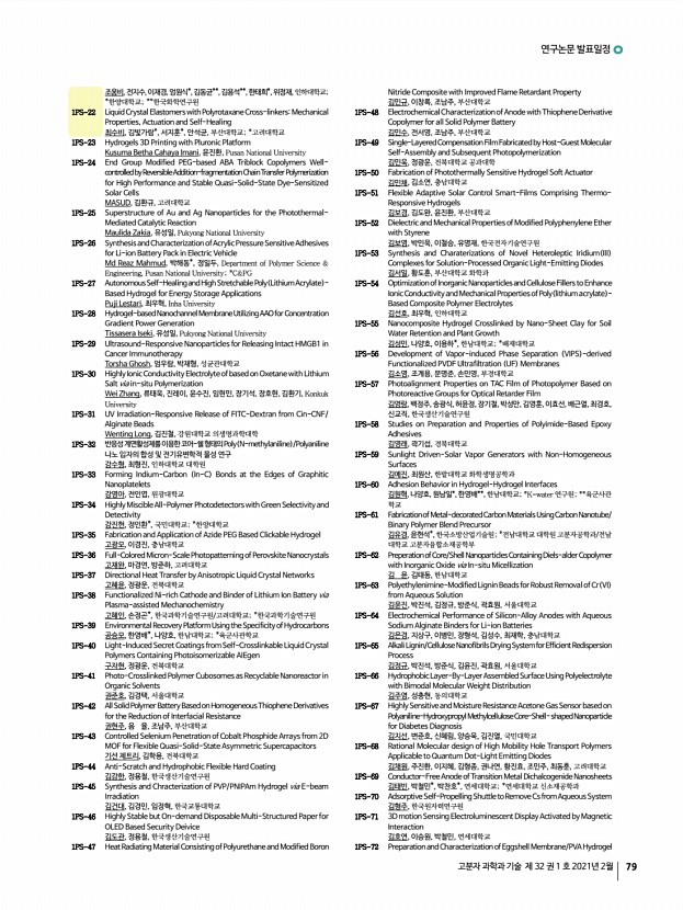 연구논문 발표일정 고분자 과학과 기술 제 32 권 1 호 2021년 2월 79 조웅비, 전지수, 이재경, 엄원식*, 김동균**, 김용석**, 한태희*, 위정재,인하대학교; *한양대학교; **한국화학연구원 1PS-22 Liquid Crystal Elastomers with Polyrotaxane Cross-linkersMechanical Properties, Actuation and Self-Healing 최수비, 김빛가람*, 서지훈*, 안석균, 부산대학교; *고려대학교 1PS-23 Hydrogels 3D Printing with Pluronic Platform Kusuma Betha Cahaya Imani, 윤진환, Pusan National University 1PS-24 End Group Modified PEG-based ABA Triblock Copolymers Wellcontrolled by Reversible Addition-fragmentation Chain TransferPolymerization for High Performance and Stable Quasi-Solid-State Dye-Sensitized Solar Cells MASUD, 김환규, 고려대학교 1PS-25 Superstructure of Au and Ag Nanoparticles for the PhotothermalMediated Catalytic Reaction Maulida Zakia, 유성일, Pukyong National University 1PS-26 Synthesis and Characterization of Acryl...