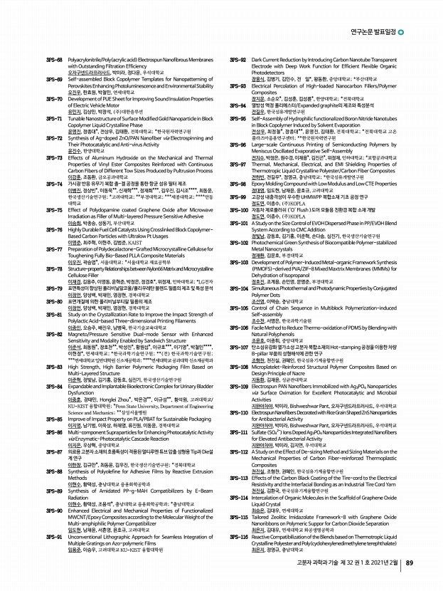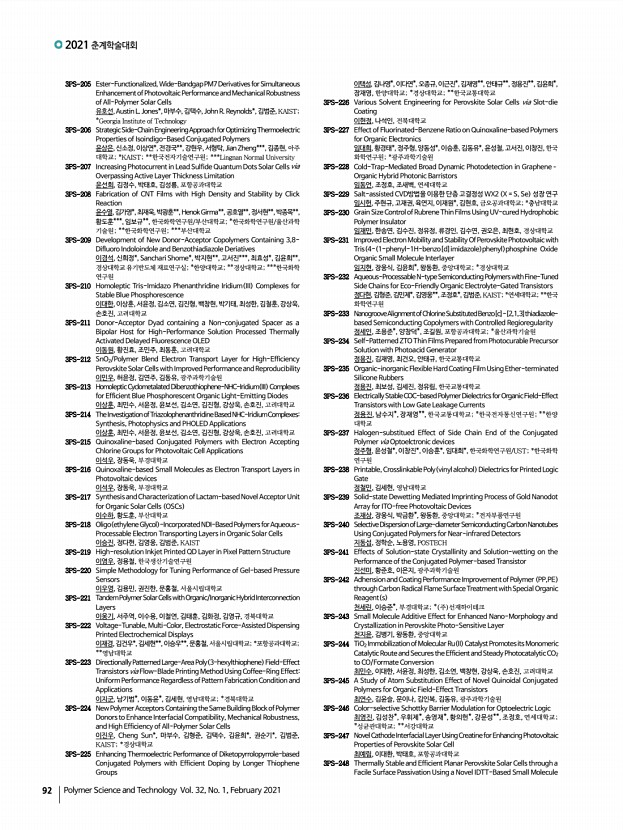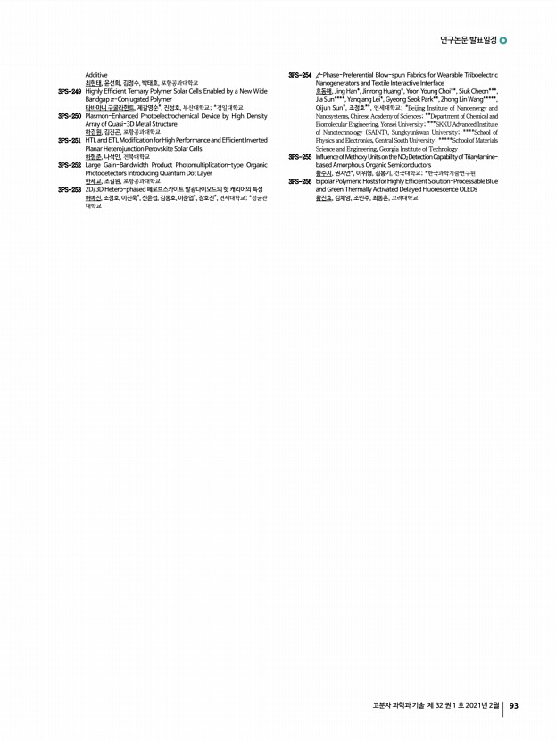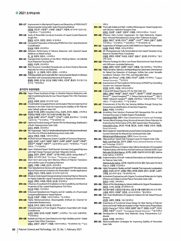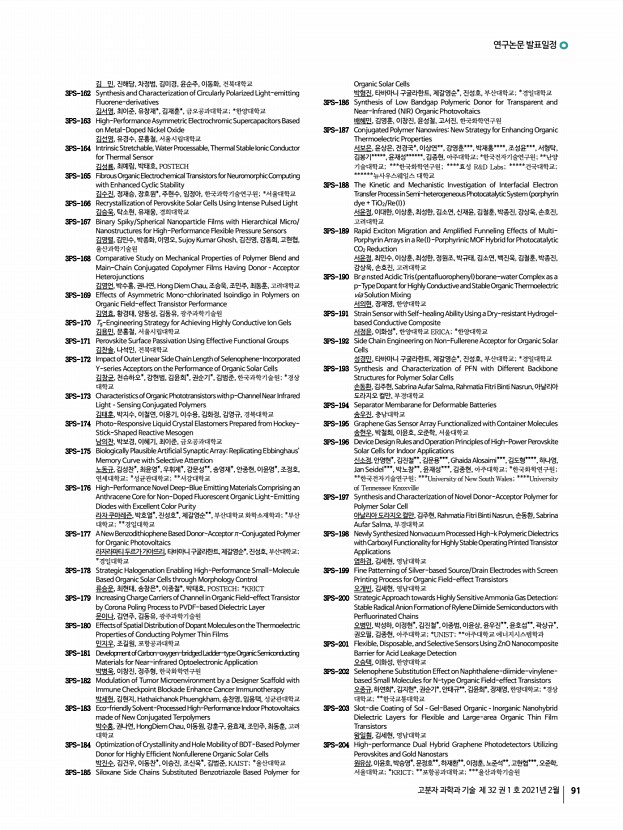 연구논문 발표일정 고분자 과학과 기술 제 32 권 1 호 2021년 2월 91 김 민, 진해담, 차정범, 김미경, 윤순주, 이동화, 전북대학교 3PS-162 Synthesis and Characterization of Circularly Polarized Light-emitting Fluorene-derivatives 김서영, 최이준, 유창재*, 김재훈*, 금오공과대학교; *한양대학교 3PS-163 High-Performance Asymmetric Electrochromic Supercapacitors Based on Metal-Doped Nickel Oxide 김선영, 유경수, 문홍철, 서울시립대학교 3PS-164 Intrinsic Stretchable, Water Processable, Thermal Stable Ionic Conductor for Thermal Sensor 김성룡, 최예림, 박태호, POSTECH 3PS-165 Fibrous Organic Electrochemical Transistors for Neuromorphic Computing with Enhanced Cyclic Stability 김수진, 정재승, 장호원*, 주현수, 임정아, 한국과학기술연구원; *서울대학교 3PS-166 Recrystallization of Perovskite Solar Cells Using Intense Pulsed Light 김승욱, 탁소현, 유재웅, 경희대학교 3PS-167 Bina...