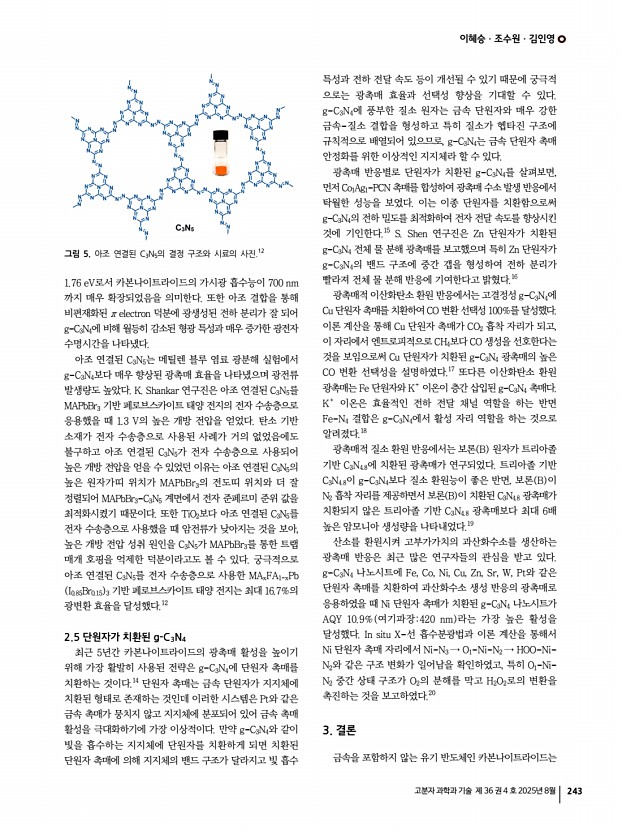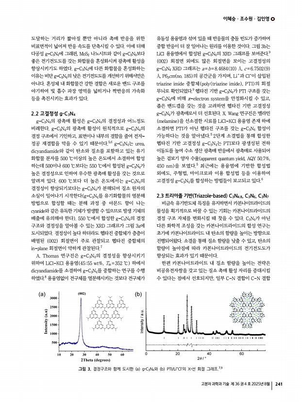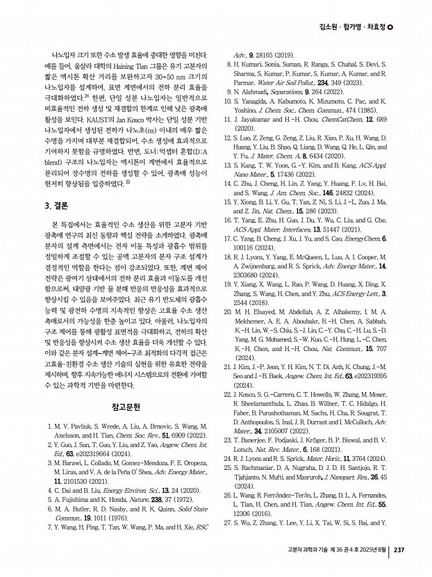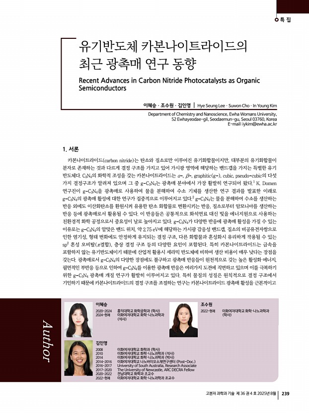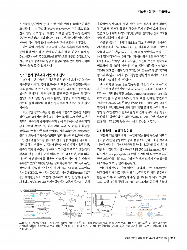 김소원ㆍ함가영ㆍ차효정 고분자 과학과 기술 제 36 권 4 호 2025년 8월 235 유전율을 증가시켜 물 흡수 및 전하 분리에 유리한 환경을 조성하며, 이는 광발광 photoluminescence, PL 강도 감소, 전하 생성 속도 향상, 재결합 억제를 통한 장수명 전하의 증가로 이어졌다. 결과적으로, OEG 고분자는 기존 알킬 기반 고분자 대비 최대 30배 높은 수소 생산 효율을 나타냈다. 이와 같이 전략적이고 정교한 고분자 광촉매 분자 설계를 통해 흡광 범위 확장, 전하 분리 효율 향상, 친수성 증가 등 수소 생산 성능의 결정요인들을 효과적으로 개선할 수 있었으며, 이는 고분자 광촉매의 응용 가능성과 향후 분자 설계 전략의 방향성을 엿볼 수 있게 한다. 2.2 고분자 광촉매의 계면 제어 전략 고분자 기반 광촉매의 계면 특성은 전하의 효과적인 분리와 이동뿐만 아니라, 촉매 표면...