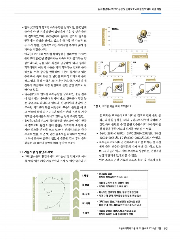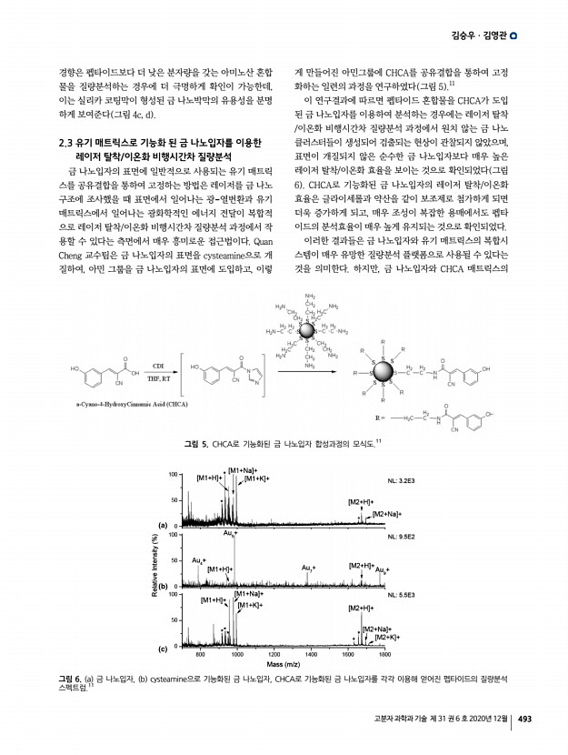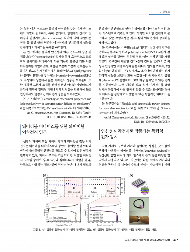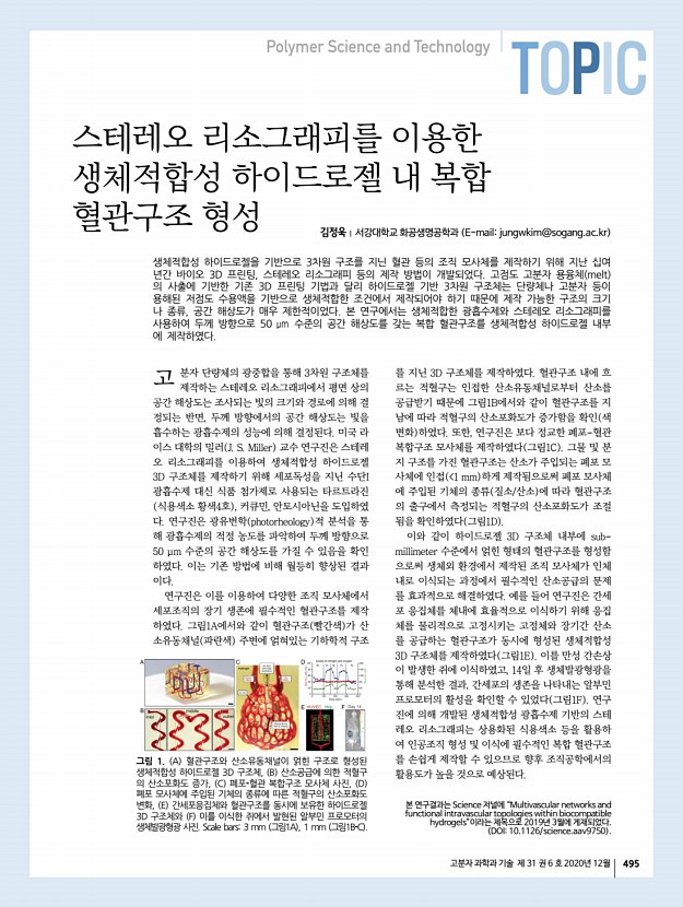 고분자 과학과 기술 제 31 권 6 호 2020년 12월 495 고 그림 1. A 혈관구조와 산소유동채널이 얽힌 구조로 형성된 생체적합성 하이드로젤 3D 구조체, B 산소공급에 의한 적혈구 의 산소포화도 증가, C 폐포-혈관 복합구조 모사체 사진, D 폐포 모사체에 주입된 기체의 종류에 따른 적혈구의 산소포화도 변화, E 간세포응집체와 혈관구조를 동시에 보유한 하이드로젤 3D 구조체와 F 이를 이식한 쥐에서 발현된 알부민 프로모터의 생체발광형광 사진. Scale bars3 mm 그림1A , 1 mm 그림1B-C 김정욱 서강대학교 화공생명공학과 E-mailjungwkim@sogang.ac.kr 생체적합성 하이드로젤을 기반으로 3차원 구조를 지닌 혈관 등의 조직 모사체를 제작하기 위해 지난 십여 년간 바이오 3D 프린팅, 스테레오 리소그래피 등의 제작 방법이 개발되었다. 고점도 고분자 용융체 melt 의 사출에 기반한 ...