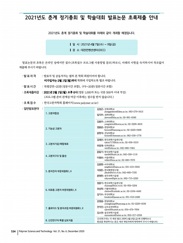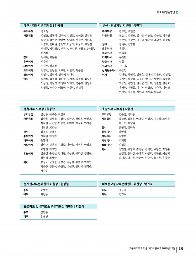제38대 임원명단 고분자 과학과 기술 제 31 권 6 호 2020년 12월 533 대구ㆍ경북지부 지부장 | 한세광 부산ㆍ경남지부 지부장 | 이원기 부지부장 자문위원 감사 총무이사 재무이사 조직이사 섭외이사 이사 권오형 강인규, 김봉식, 김우식, 김진곤, 노석균, 민경은, 박수영, 박이순, 박찬언, 박태호, 서길수, 서관호, 서장혁, 손태원, 송동익, 이동호, 이문호, 이원철, 장태현, 제갈영순, 조광수, 조길원, 진왕철, 최이준, 하기룡 김세현, 이동윤 박수진 이승우, 정운룡 김영진, 손창윤, 오태환, 이윤구, 현동춘 김연수, 김영기, 정경혜, 정대성 곽기섭, 김성철, 김원종, 김재홍, 김종복, 김황용, 노용영, 박문정, 박영태, 박태호, 변홍식, 안형주, 엄인철, 오승수, 이용민, 정현민, 진경식 부지부장 자문위원 감사 총무이사 재무이사 기획이사 학술이사 섭외이사 산학협동이...
