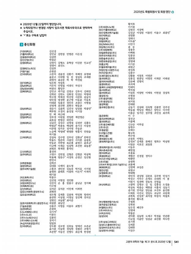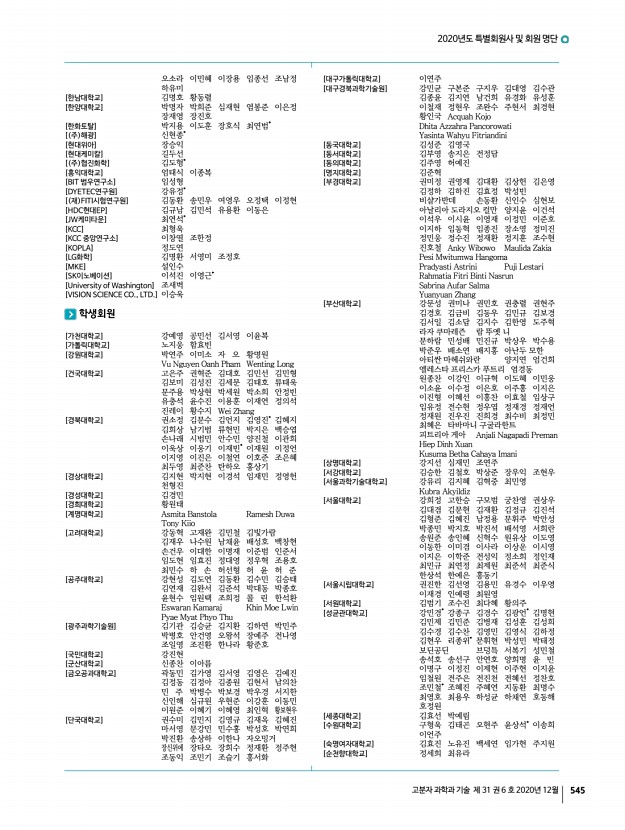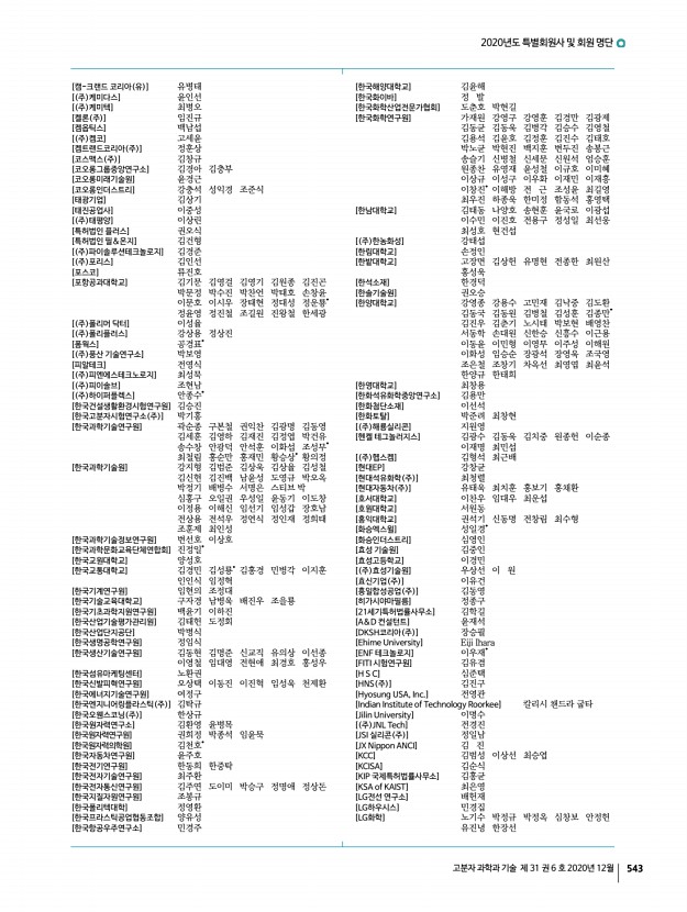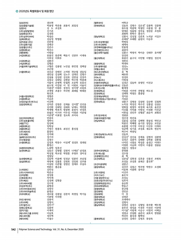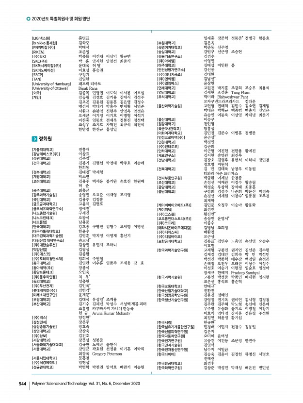 2020년도 특별회원사 및 회원 명단 고분자 과학과 기술 제 31 권 6 호 2020년 12월 545 오소라 이민혜 이장용 임종선 조남정 하유미 [한남대학교] 김명호 황동렬 [한양대학교] 박명자 박희준 심재현 염봉준 이은정 장재영 장진호 [한화토탈] 박지용 이도훈 장호식 최연범* [ 주 해광] 신현종* [현대위아] 장승익 [현대케미칼] 길두선 [ 주 협진화학] 김도형* [홍익대학교] 엄태식 이종복 [BIT 범우연구소] 임성형 [DYETEC연구원] 강유정* [ 재 FITI시험연구원] 김동환 송민우 여영우 오정택 이정현 [HDC현대EP] 김규남 김민석 유용환 이동은 [JW케미타운] 최연석* [KCC] 최형욱 [KCC 중앙연구소] 이창열 조한정 [KOPLA] 정도연 [LG화학] 김명환 서영미 조정호 [MKE] 설인수 [SK이노베이션] 이석진 이영근* [University of Washington] 조새벽 [VISION SCIENCE CO., LTD.] 이승욱 학생회원 [가천대학교] 강...