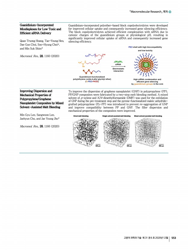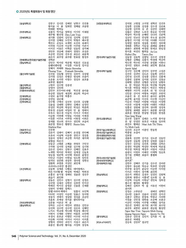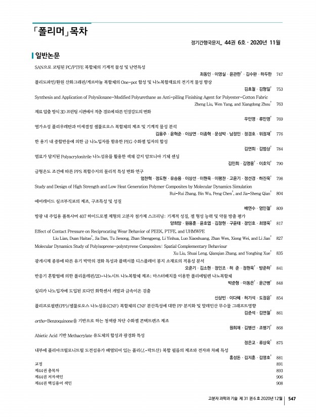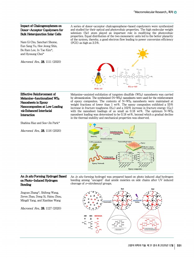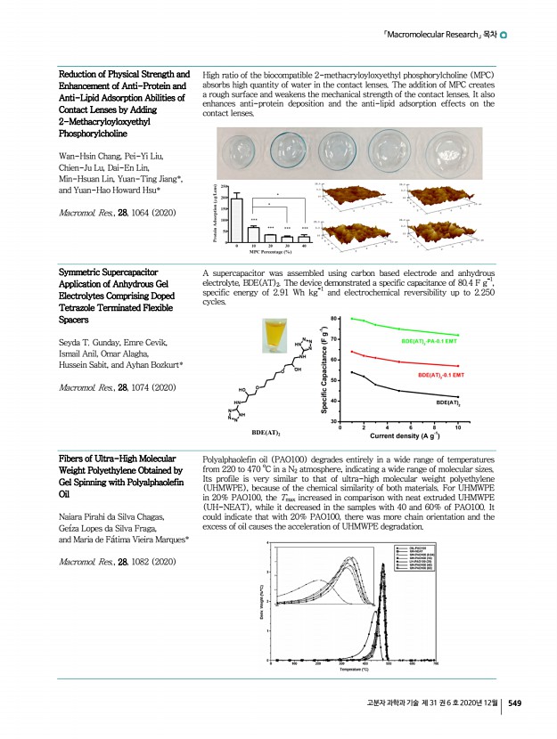 「Macromolecular Research」 목차 고분자 과학과 기술 제 31 권 6 호 2020년 12월 549 Reduction of Physical Strength and Enhancement of Anti-Protein and Anti-Lipid Adsorption Abilities of Contact Lenses by Adding 2-Methacryloyloxyethyl Phosphorylcholine Wan-Hsin Chang, Pei-Yi Liu, Chien-Ju Lu, Dai-En Lin, Min-Hsuan Lin, Yuan-Ting Jiang*, and Yuan-Hao Howard Hsu* Macromol. Res., 28, 1064 2020 High ratio of the biocompatible 2-methacryloyloxyethyl phosphorylcholine MPC absorbs high quantity of water in the contact lenses. The addition of MPC creates a rough surface and weakens the mechanical strength of the contact lenses. It also enhances anti-protein deposition and the anti-lipid adsorption effects on the contact lenses. Symmetric Supercapacitor Application of Anhydrous Gel Electrolytes Comprising Doped Tetrazole Terminated Flexible Spacers Seyda T. Gunday, Emre Cevik, Ismail Anil, Omar Alagha, Hussein Sabit, and Ayhan Bozkurt* Macromol. Res., 28, 1074 2020 A supercapacito...