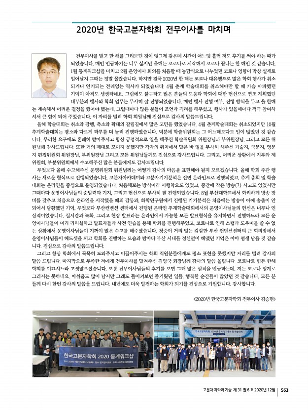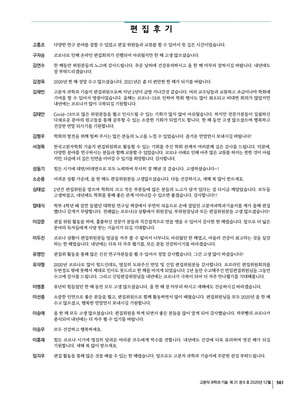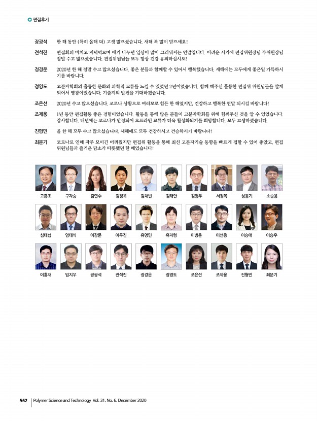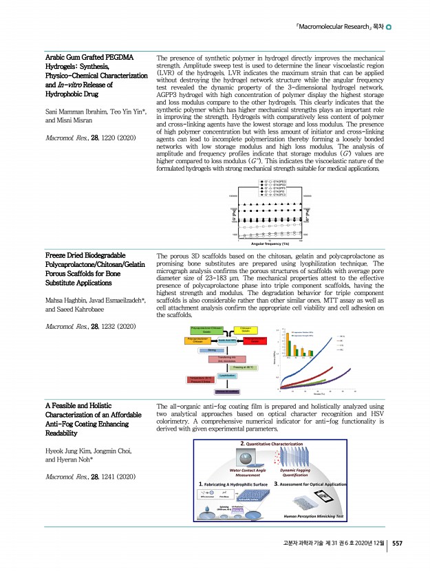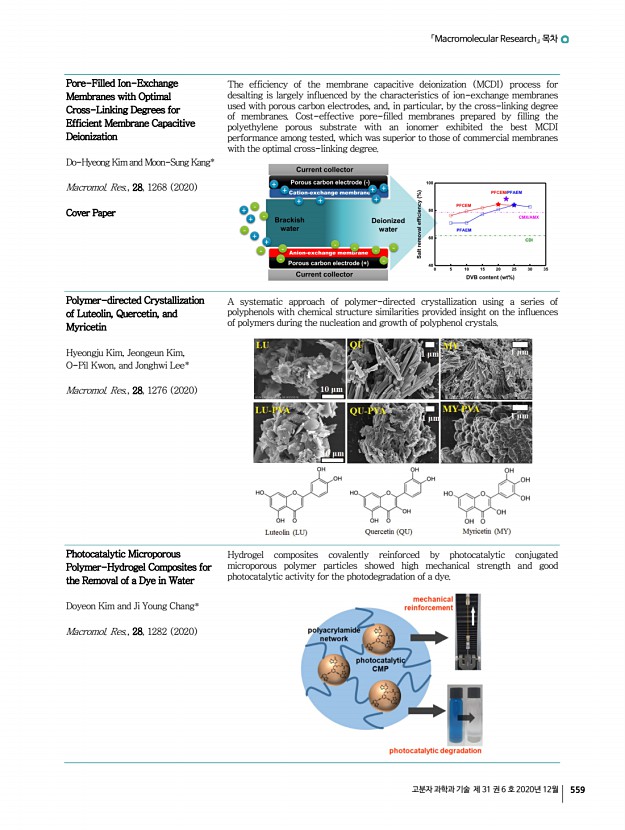 「Macromolecular Research」 목차 고분자 과학과 기술 제 31 권 6 호 2020년 12월 559 Pore-Filled Ion-Exchange Membranes with Optimal Cross-Linking Degrees for Efficient Membrane Capacitive Deionization Do-Hyeong Kim and Moon-Sung Kang* Macromol. Res., 28, 1268 2020 Cover Paper The efficiency of the membrane capacitive deionization MCDI process for desalting is largely influenced by the characteristics of ion-exchange membranes used with porous carbon electrodes, and, in particular, by the cross-linking degree of membranes. Cost-effective pore-filled membranes prepared by filling the polyethylene porous substrate with an ionomer exhibited the best MCDI performance among tested, which was superior to those of commercial membranes with the optimal cross-linking degree. Polymer-directed Crystallization of Luteolin, Quercetin, and Myricetin Hyeongju Kim, Jeongeun Kim, O-Pil Kwon, and Jonghwi Lee* Macromol. Res., 28, 1276 2020 A systematic approach of polymer-directed crystalli...