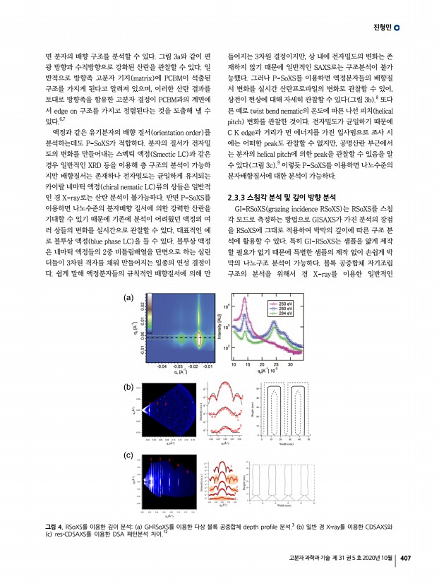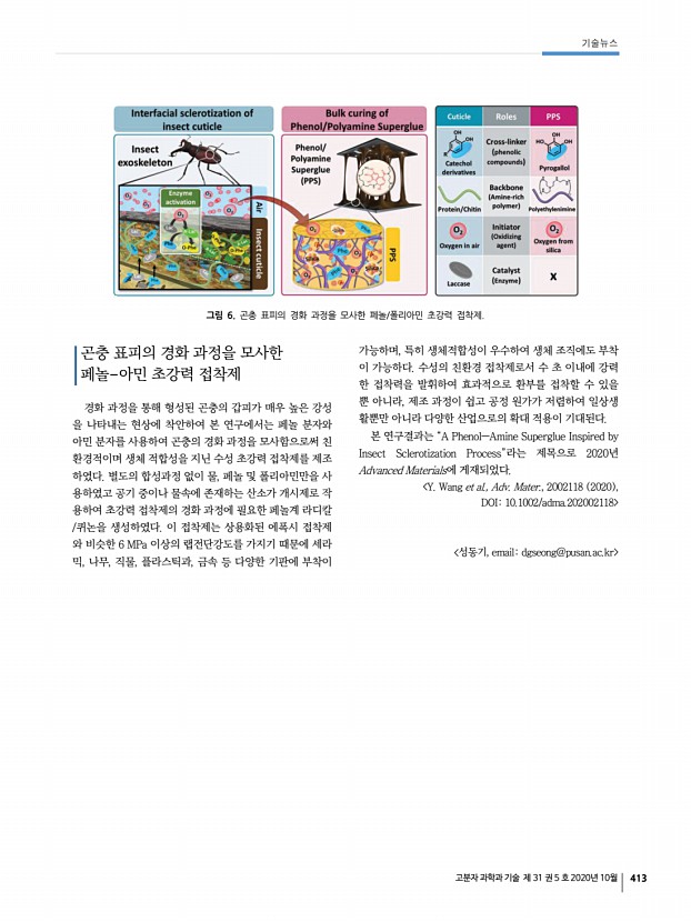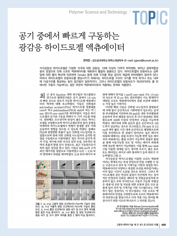 고분자 과학과 기술 제 31 권 5 호 2020년 10월 409 최 그림 1. a, e-g 고출력 광원 조건에서의 PSA-PB 구슬의 점핑 모션, b, h-j 저출력 광원 조건에서의 PSA-PB 구슬의 롤링 모션, c, k-m 롤링 모션에서의 광원 세기 및 조사 영역 제어를 통한 좁은 터널 통과하기, d, n-s 롤링 및 점핑 모션에서의 광원 세기 및 조사 영역 제어를 통한 Z 형태 터널 통과하기. 전석진 금오공과대학교 화학소재공학부 E-mailsjjeon@kumoh.ac.kr 자극감응성 하이드로젤은 다양한 자극에 대한 감응성, 10배 이상의 가역적 부피변화, 뛰어난 생체적합성 등의 장점으로 인해 소프트 액츄에이터용 재료로서 활발히 응용되고 있다. 하이드로젤의 반응속도는 삼투 압에 의한 물의 확산에 의존하며 Tanaka 등에 의해 구조물 특성 길이의 제곱에 반비례함이 알려져 있다. 따라서 하이드로젤의 반응속도를 향상시키...