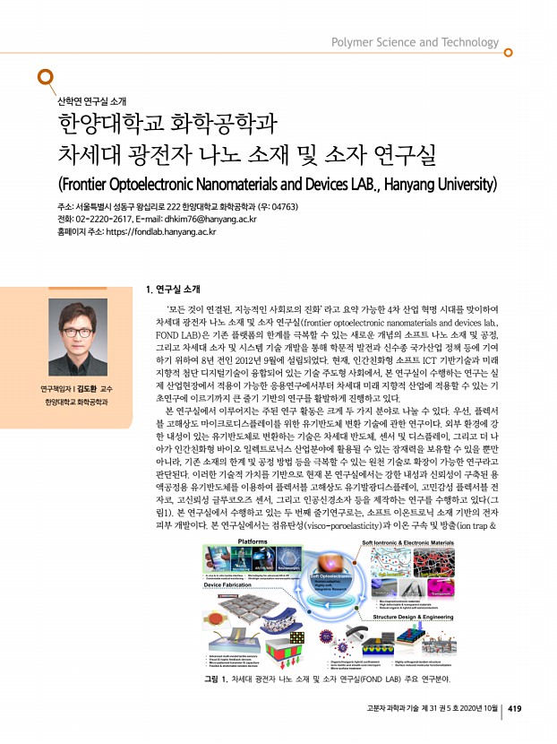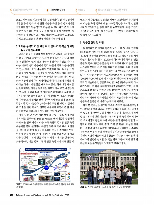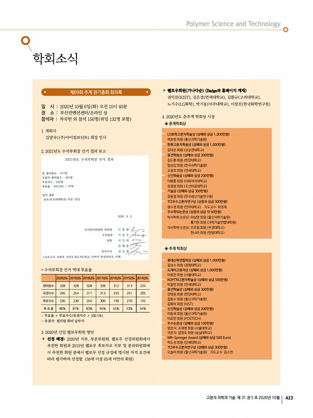 ...한 회원 중에서 펠로우 선정 규정에 명시된 자격 요건에 따라 평가하여 선정함. 58세 이상 65세 미만의 회원 ▫ 펠로우회원 가나다순 Badge와 홈페이지 게재 권익찬 KIST , 김은경 연세대학교 , 김환규 고려대학교 , 노기수 LG화학 , 박기동 아주대학교 , 이창진 한국화학연구원 4. 2020년도 춘추계 학회상 시상 ◈ 춘계학회상 LG화학고분자학술상 상패와 상금 1,000만원 백종범 회원 울산과학기술원 한화고분자학술상 상패와 상금 1,000만원 김덕준 회원 성균관대학교 중견학술상 상패와 상금 300만원 김도환 회원 한양대학교 임성갑 회원 한국과학기술원 조정호 회원 연세대학교 신진학술상 상패와 상금 200만원 이병훈 회원 이화여자대학교 정경원 회원 조선이공대학교 기술상 상패와 상금 300만원 정용철 회원 한국생산기술연구원 TCI우수고분자연구상 상장과 상금...