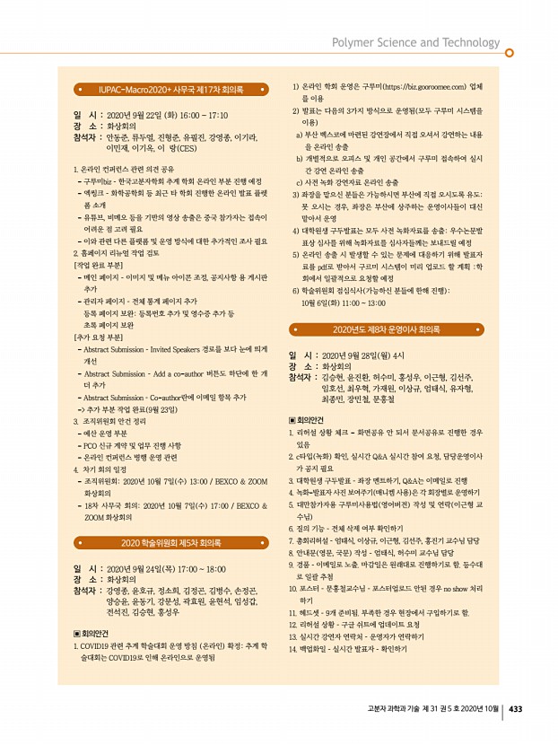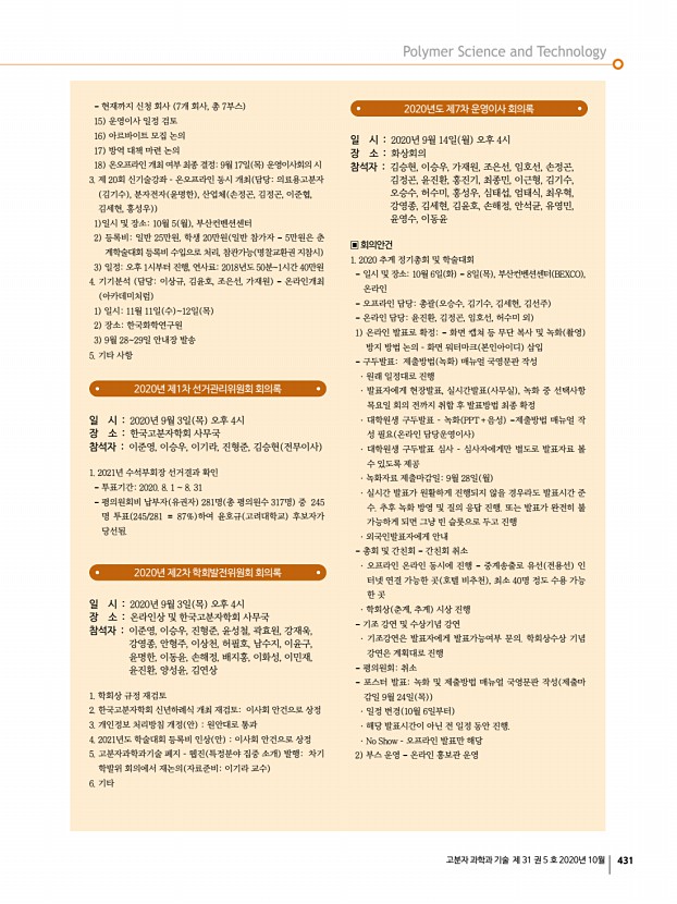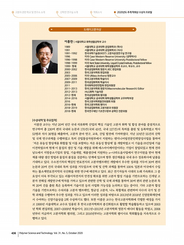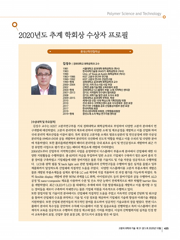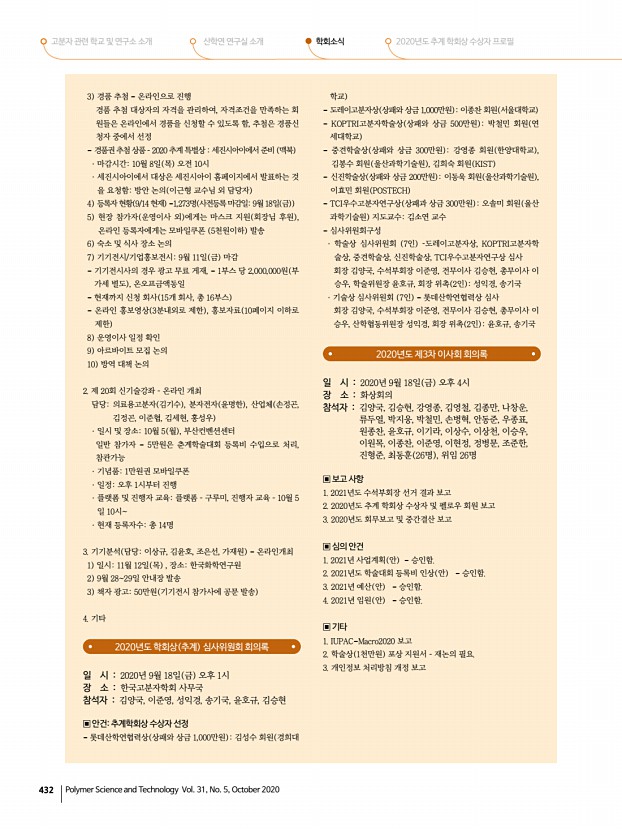 ...분자학회 사무국 참석자 김양국, 이준영, 성익경, 송기국, 윤호규, 김승현 ▣ 안건추계학회상 수상자 선정 롯데산학연협력상 상패와 상금 1,000만원 김성수 회원 경희대 학교 도레이고분자상 상패와 상금 1,000만원 이종찬 회원 서울대학교 KOPTRI고분자학술상 상패와 상금 500만원 박철민 회원 연 세대학교 중견학술상 상패와 상금 300만원 강영종 회원 한양대학교 , 김봉수 회원 울산과학기술원 , 김희숙 회원 KIST 신진학술상 상패와 상금 200만원 이동욱 회원 울산과학기술원 , 이효민 회원 POSTECH TCI우수고분자연구상 상패과 상금 300만원 오솔미 회원 울산 과학기술원 지도교수김소연 교수 심사위원회구성 · 학술상 심사위원회 7인 –도레이고분자상, KOPTRI고분자학 술상, 중견학술상, 신진학술상, TCI우수고분자연구상 심사 회장 김양국, 수석부회장 이준영, 전...