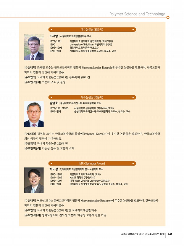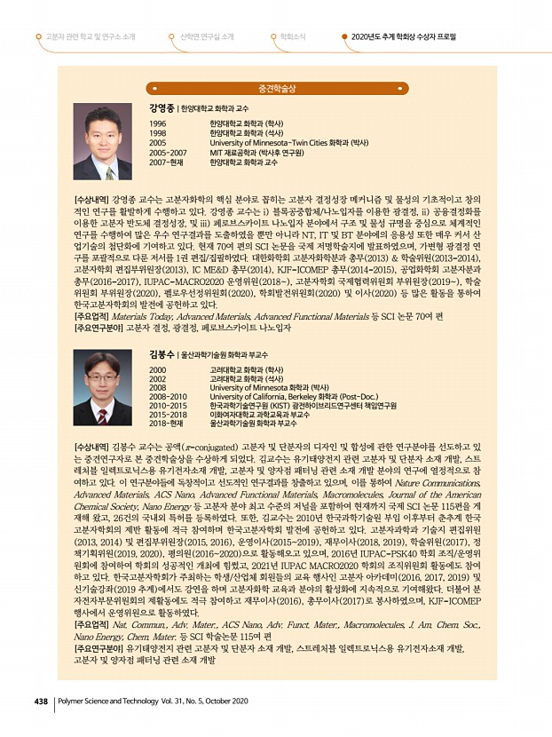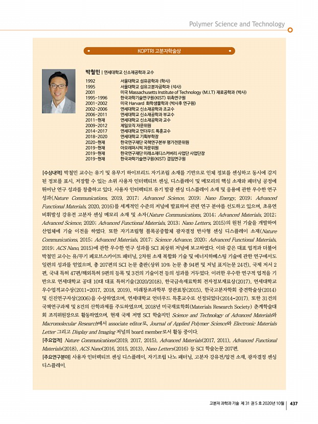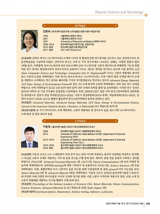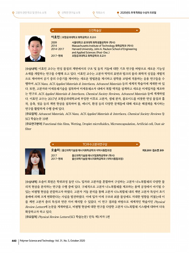 ...축, 젖음 등의 계면 현상을 접목하여 물, 에너지, 환경 등의 다양한 문제들에 대해 새로운 해결책을 제시하는 연구를 활발하게 수행 중에 있다. [주요업적] Advanced Materials, ACS Nano, ACS Applied Materials & Interfaces, Chemical Society Reviews 등 SCI 학술논문 19편 [주요연구분야] Functional thin films, Wetting, Droplet microfluidics, Microencapsulation, Artificial cell, Dust air filter TCI우수고분자연구상 오솔미|울산과학기술원 에너지화학공학과 석박사통합과정 지도교수김소연 교수 2017 울산과학기술원 에너지및화학공학부 학사 2017-현재 울산과학기술원 에너지화학공학과 석박사통합과정 [수상내역] 오솔미 회원은 학위과정 동안 나노 입자와 고분자를 혼합하여 구성하는 고분자 나노복합체의 다양한 물 리적 현상을 분석하는 연구를 수행 중에 있다. 구체적으로 고분자 나노복합체를 제...