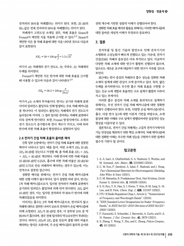 양현성ㆍ전윤석 고분자 과학과 기술 제 36 권 4 호 2025년 8월 251 대역에 따라 여러 구간으로 구분되며, 이에 대한 표준 대역은 전기전자공학자협회 IEEE , 국제전기통신연합 ITU , 유럽연합 EU , 북대서양 조약 기구 NATO 등 여러 기관에서 제정하고 있다. 다만, 각 기관에서 설정한 기준은 상이하며, 용도에 따라 선택적으로 사용된다. 현재 연구와 산업에서 주로 활용되는 분류 체계는 ITU와 IEEE에서 제정한 기준이며, 이는 그림 1에 제시되어 있다.5,6 2.2 전자기 간섭 차폐 메커니즘 전자기 간섭 차폐 메커니즘은 크게 반사 reflection , 흡수 absorption , 다중 반사 multiple reflection 로 구분될 수 있다 그림 2 본 절에서는 차폐 메커니즘의 개념에 대해 논의하고자 한다. 2.2.1 반사 반사는 전자파가 차폐재 표면에서 반사되는 현상으로, 주로 전기전도도가 높은 소재에서 발생...