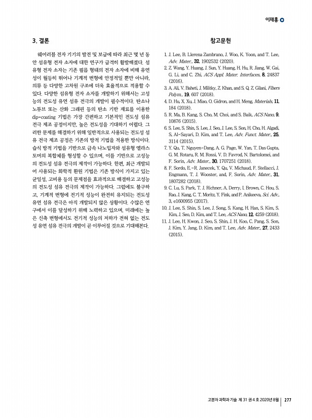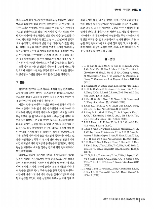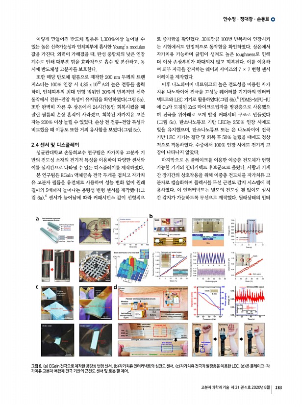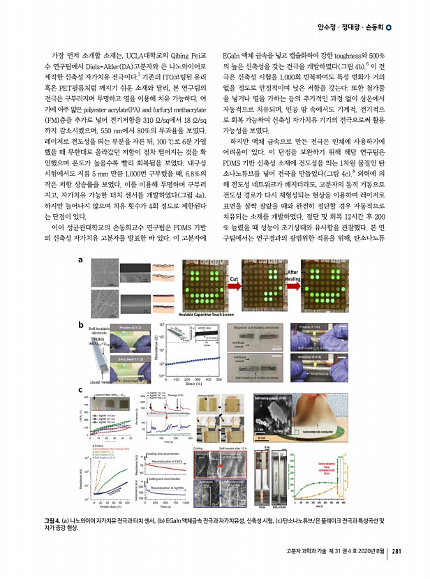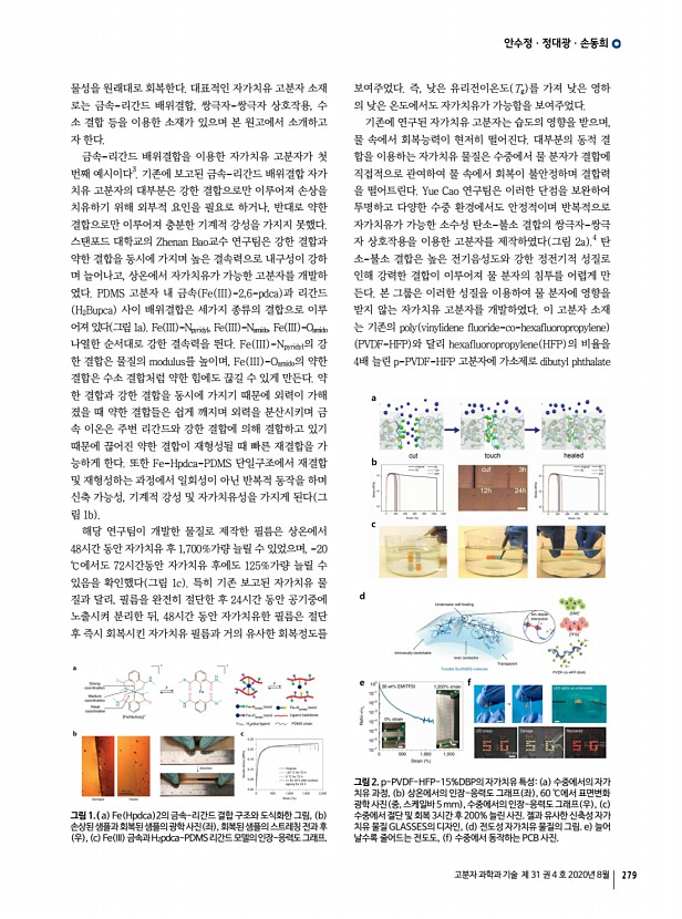 안수정ㆍ정대광ㆍ손동희 고분자 과학과 기술 제 31 권 4 호 2020년 8월 279 그림 1. a Fe Hpdca 2의 금속-리간드 결합 구조와 도식화한 그림, b 손상된 샘플과 회복된 샘플의 광학 사진 좌 , 회복된 샘플의 스트레칭 전과 후 우 , c Fe III 금속과 H2pdca-PDMS 리간드 모델의 인장-응력도 그래프. 그림 2. p-PVDF-HFP-15%DBP의 자가치유 특성a 수중에서의 자가 치유 과정, b 상온에서의 인장-응력도 그래프 좌 , 60 ℃에서 표면변화 광학 사진 중, 스케일바 5 mm , 수중에서의 인장-응력도 그래프 우 , c 수중에서 절단 및 회복 3시간 후 200% 늘린 사진. 젤과 유사한 신축성 자가 치유 물질 GLASSES의 디자인, d 전도성 자가치유 물질의 그림. e 늘어 날수록 줄어드는 전도도, f 수중에서 동작하는 PCB 사진. 물성을 원래대로 회복한다. 대표적인 자가치유 고분자 소재 로는 금속-리간드 배위결합,...