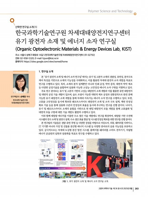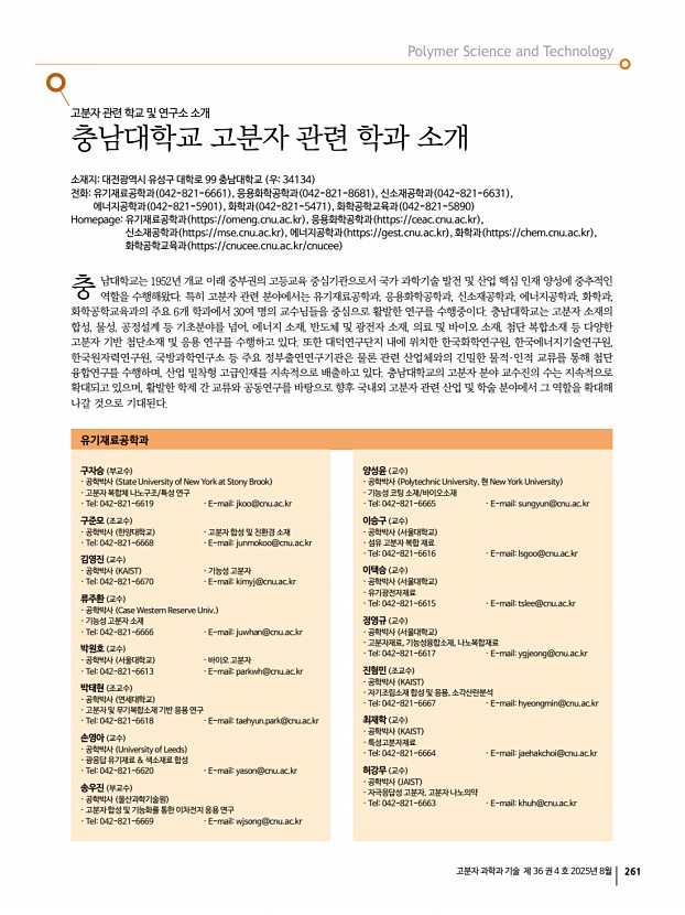 고분자 과학과 기술 제 36 권 4 호 2025년 8월 261 고분자 관련 학교 및 연구소 소개 충남대학교 고분자 관련 학과 소개 소재지대전광역시 유성구 대학로 99 충남대학교 우34134 전화유기재료공학과 042-821-6661 , 응용화학공학과 042-821-8681 , 신소재공학과 042-821-6631 , 에너지공학과 042-821-5901 , 화학과 042-821-5471 , 화학공학교육과 042-821-5890 Homepage유기재료공학과 https//omeng.cnu.ac.kr , 응용화학공학과 https//ceac.cnu.ac.kr , 신소재공학과 https//mse.cnu.ac.kr , 에너지공학과 https//gest.cnu.ac.kr , 화학과 https//chem.cnu.ac.kr , 화학공학교육과 https//cnucee.cnu.ac.kr/cnucee 남대학교는 1952년 개교 이래 중부권의 고등교육 중심기관으로서 국가 과학기술 발전 및 산업 핵심 인재 양성에 중추적인 역할을 수행해왔다. 특히 고분자 관련 분야에서는 유기재료공학과, 응용화학공학과, 신소재공학과,...