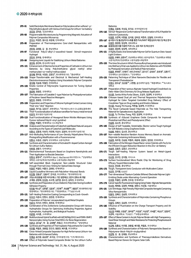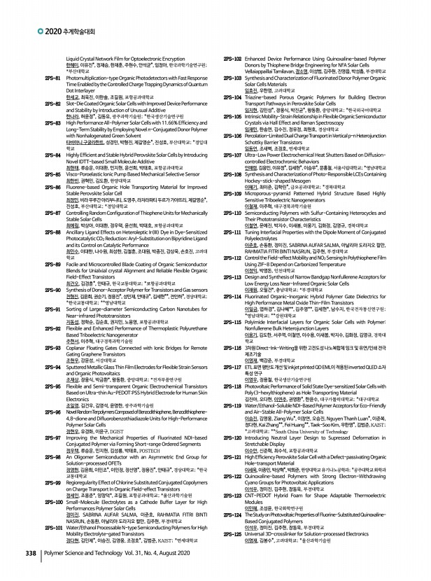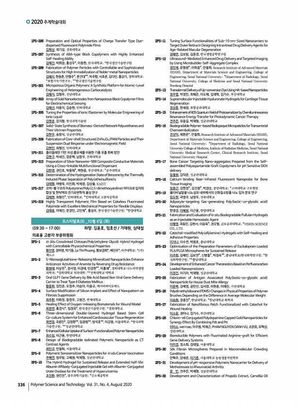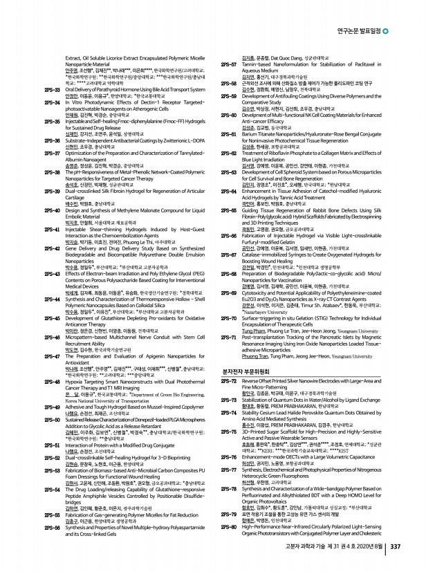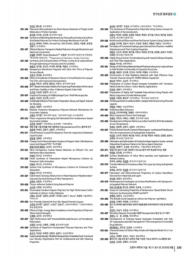 연구논문 발표일정 고분자 과학과 기술 제 31 권 4 호 2020년 8월 335 이강인, 황도훈, 부산대학교 1PS-193 Plasmonic Microcylinders for Direct Raman Detection of Target Small Molecules in Pristine Samples 윤지원, 이건호, 김신현, 한국과학기술원 1PS-195 Synthesis of Blending Membranes by Florosulfonyl Imide and Sulfonic Acid Based Polymers for Proton Exchange Membranes Fuel Cell 윤수진, 류태욱, 진레이, Ahmed Faiz, WEI ZHANG, 김대호, 이용훈, 장호현, 김환기, 건국대학교 1PS-197 Efficient Electron Transport in Radical Polymers through Mixed Ionic and Electronic Conduction 유일환, 전대영*, Bryan Boudouris**, 주용호*,한국과학기술연구원 전북분원; *한국과학기술연구원; **Department of Chemistry, Purdue University 1PS-199 Synthesis and Characterization of Photo-curing Acryl-polyurethane through Optimizing of Viscosity and UV Condition 원종찬, 정석훈, 민진규, 이규혁, 배지홍, 허필호, ...