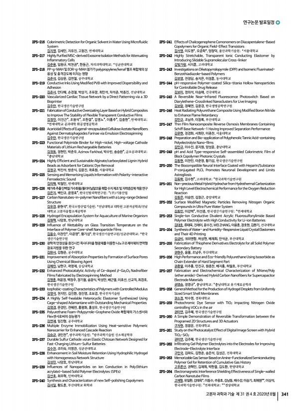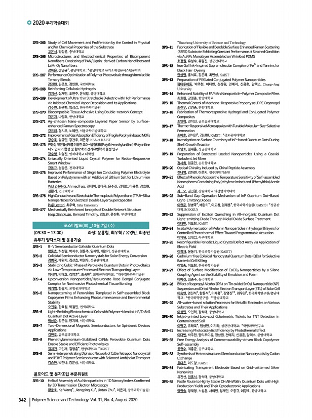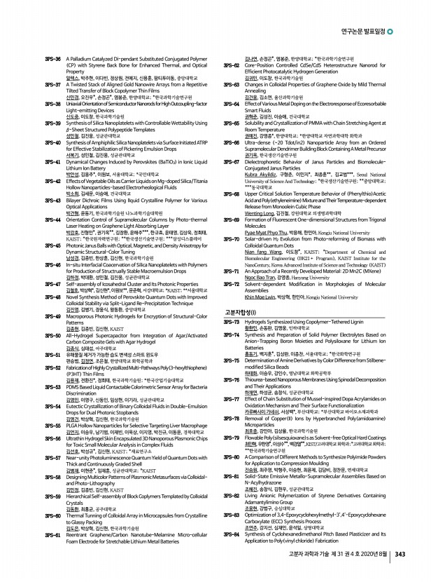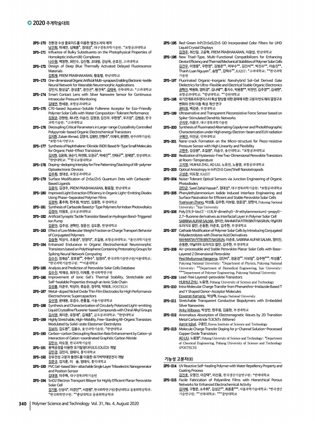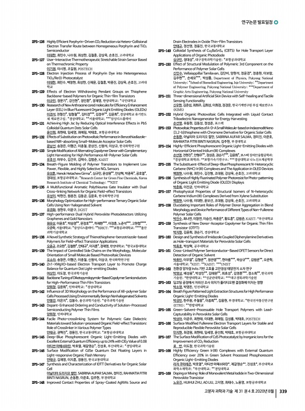 연구논문 발표일정 고분자 과학과 기술 제 31 권 4 호 2020년 8월 339 2PS-126 Highly Efficient Porphyrin-Driven CO2 Reduction via Hetero-Collisional Electron Transfer Route between Homogeneous Porphyrin and TiO2 Semiconductor 이대한, 최민수, 나수원, 최성한, 김철훈, 강상욱, 손호진, 고려대학교 2PS-127 User-Interactive Thermotherapeutic Stretchable Strain Sensor Based on Thermochromic Property 이기원, 이시영, 조길원, POSTECH 2PS-128 Electron Injection Process of Porphyrin Dye into Heterogeneous TiO2/Re I Photocatalyst 이대한, 최민수, 백창현, 최성한, 신재윤, 김철훈, 박종진, 강상욱, 손호진, 고려대 학교 2PS-129 Effects of Electron Withdrawing Pendant Groups on Thiophene Backbone-based Polymers for Organic Thin-film Transistors 이규민, 정문기*, 강진현*, 정인환*, 장재영, 한양대학교; *국민대학교 2PS-130 Reasearch of New Anthracene cored molecules for Efficiency Enhancement Layer EEL in B...