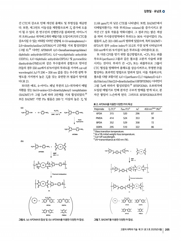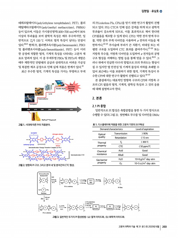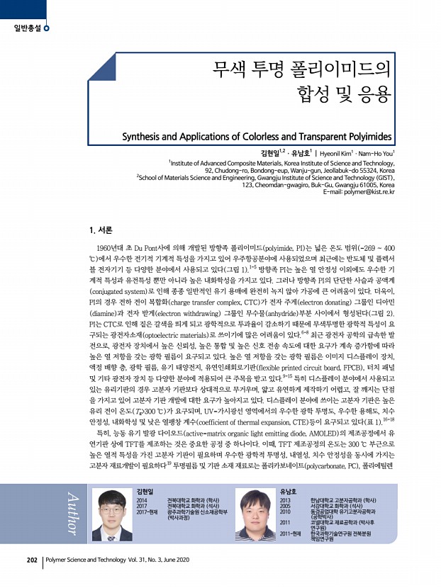 202 Polymer Science and Technology Vol. 31, No. 3, June 2020 김현일 2014 전북대학교 화학과 학사 2017 전북대학교 화학과 석사 2017-현재 광주과학기술원 신소재공학부 박사과정 유남호 2013 한남대학교 고분자공학과 학사 2005 서강대학교 화학과 석사 2010 동경공업대학 유기고분자공학과 공학박사 2011 코넬대학교 재료공학과 박사후 연구원 2011-현재 한국과학기술연구원 전북분원 책임연구원 무색 투명 폴리이미드의 합성 및 응용 Synthesis and Applications of Colorless and Transparent Polyimides 김현일1,2ㆍ유남호1 | Hyeonil Kim1ㆍNam-Ho You1 1Institute of Advanced Composite Materials, Korea Institute of Science and Technology, 92, Chudong-ro, Bondong-eup, Wanju-gun, Jeollabuk-do 55324, Korea 2School of Materials Science and Engineering, Gwangju Institute of Science and Technology GIST , 123, Cheomdan-gwagiro, Buk-Gu, Gwangju 61005, Korea E-mailpolymer@kist.re.kr 1. ...