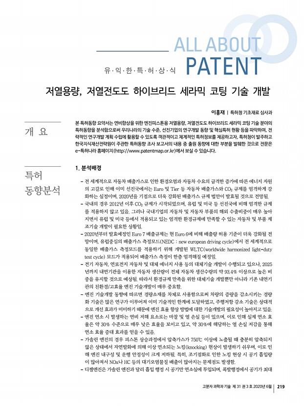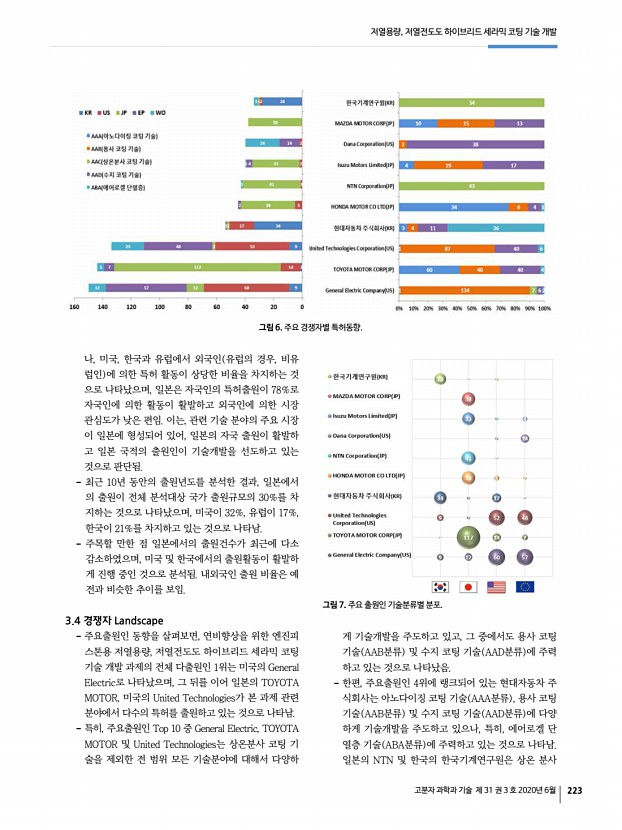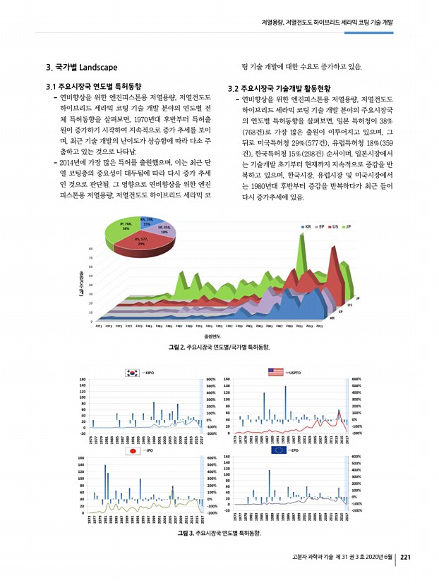 저열용량, 저열전도도 하이브리드 세라믹 코팅 기술 개발 고분자 과학과 기술 제 31 권 3 호 2020년 6월 223 그림 6. 주요 경쟁자별 특허동향. 그림 7. 주요 출원인 기술분류별 분포. 나, 미국, 한국과 유럽에서 외국인 유럽의 경우, 비유 럽인 에 의한 특허 활동이 상당한 비율을 차지하는 것 으로 나타났으며, 일본은 자국인의 특허출원이 78%로 자국인에 의한 활동이 활발하고 외국인에 의한 시장 관심도가 낮은 편임. 이는, 관련 기술 분야의 주요 시장 이 일본에 형성되어 있어, 일본의 자국 출원이 활발하 고 일본 국적의 출원인이 기술개발을 선도하고 있는 것으로 판단됨. 최근 10년 동안의 출원년도를 분석한 결과, 일본에서 의 출원이 전체 분석대상 국가 출원규모의 30%를 차 지하는 것으로 나타났으며, 미국이 32%, 유럽이 17%, 한국이 21%를 차지하고 있는 것...