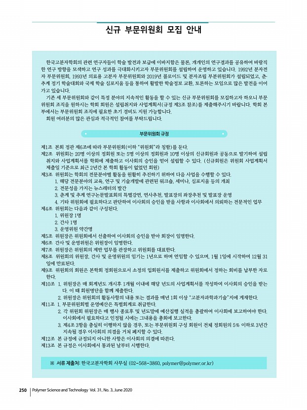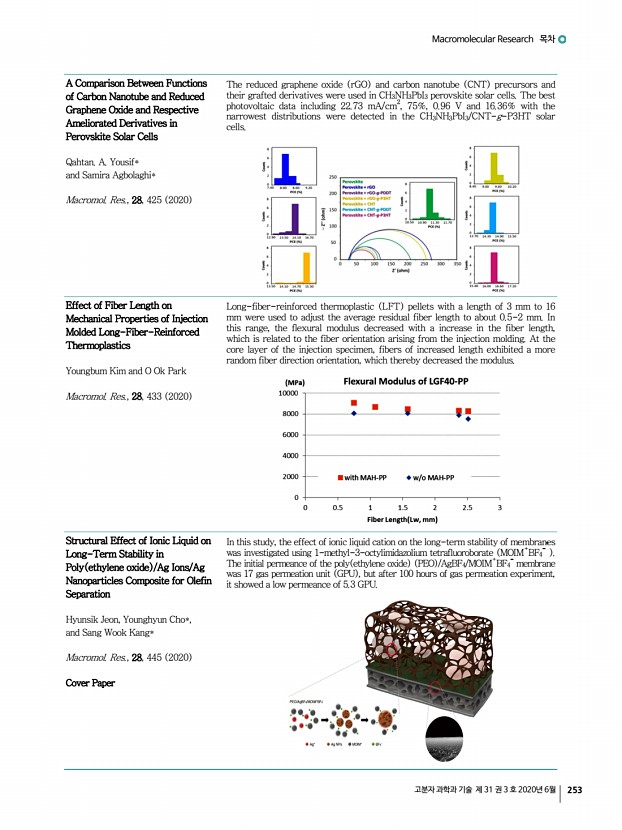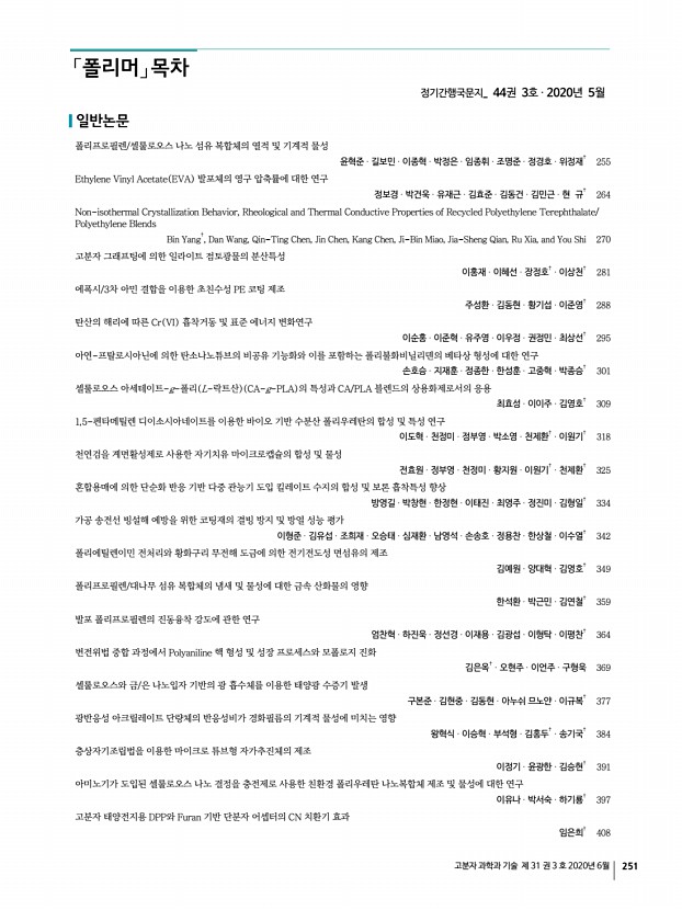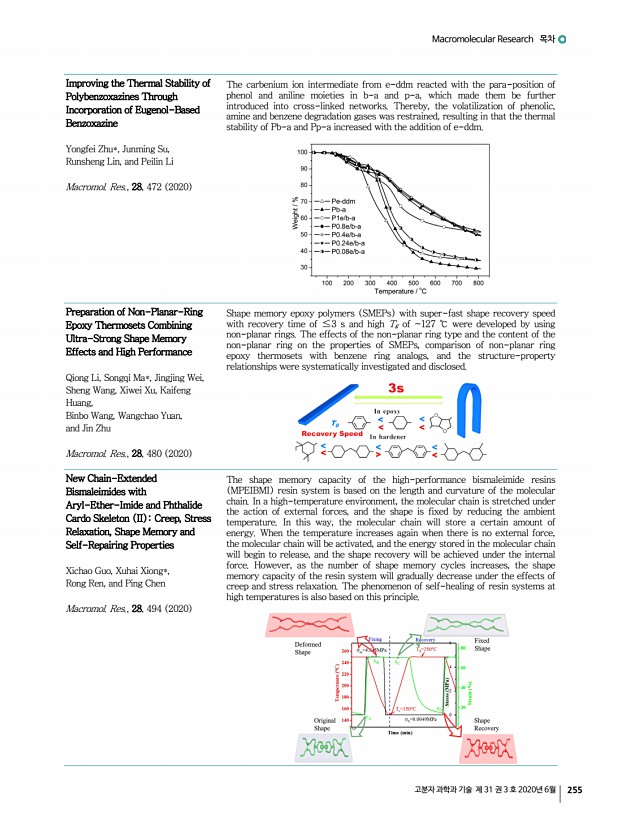 Macromolecular Research 목차 고분자 과학과 기술 제 31 권 3 호 2020년 6월 255 Improving the Thermal Stability of Polybenzoxazines Through Incorporation of Eugenol-Based Benzoxazine Yongfei Zhu*, Junming Su, Runsheng Lin, and Peilin Li Macromol. Res., 28, 472 2020 The carbenium ion intermediate from e-ddm reacted with the para-position of phenol and aniline moieties in b-a and p-a, which made them be further introduced into cross-linked networks. Thereby, the volatilization of phenolic, amine and benzene degradation gases was restrained, resulting in that the thermal stability of Pb-a and Pp-a increased with the addition of e-ddm. Preparation of Non-Planar-Ring Epoxy Thermosets Combining Ultra-Strong Shape Memory Effects and High Performance Qiong Li, Songqi Ma*, Jingjing Wei, Sheng Wang, Xiwei Xu, Kaifeng Huang, Binbo Wang, Wangchao Yuan, and Jin Zhu Macromol. Res., 28, 480 2020 Shape memory epoxy polymers SMEPs with super-fast shape recovery speed with recovery time of ...