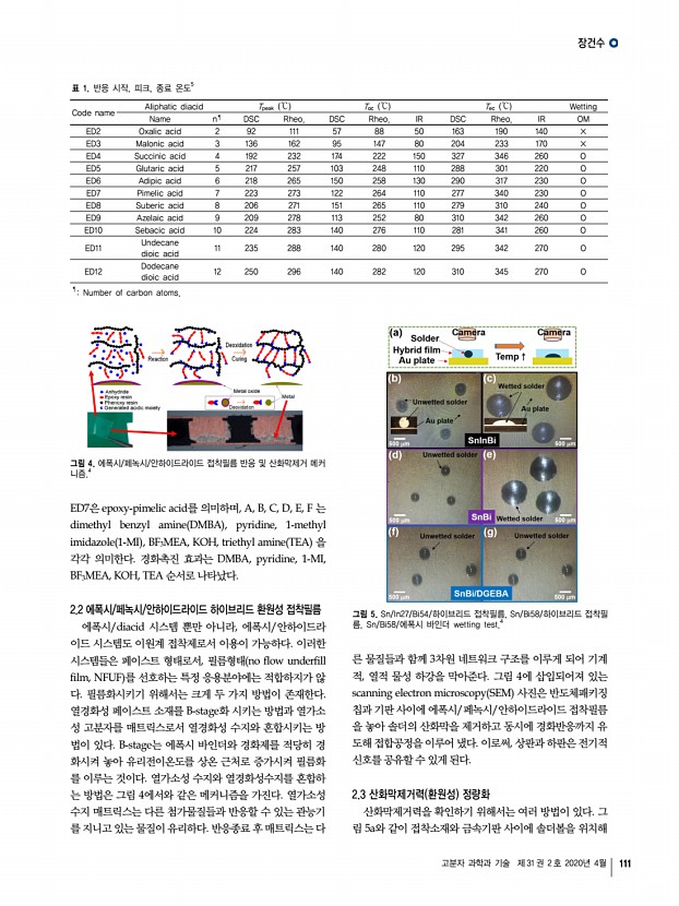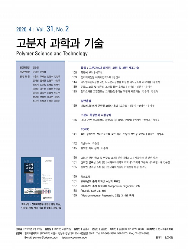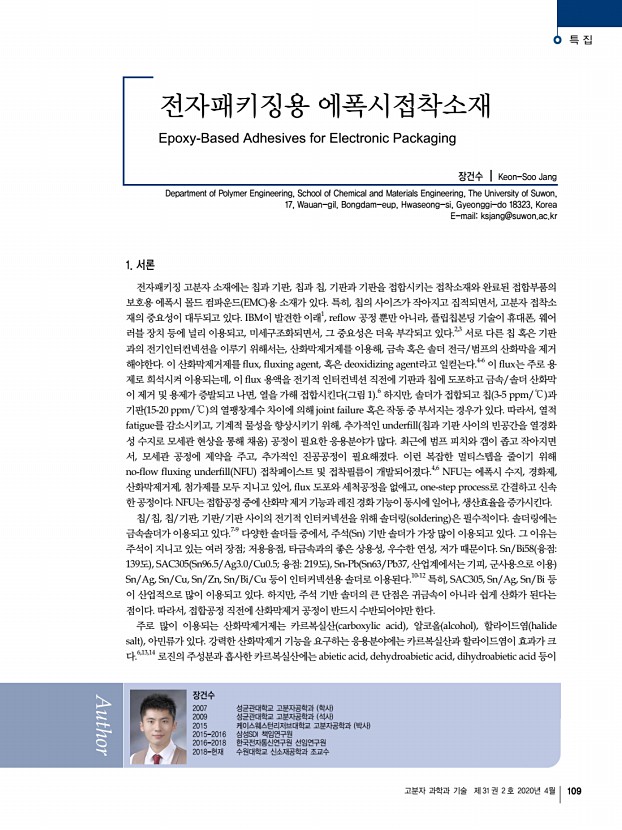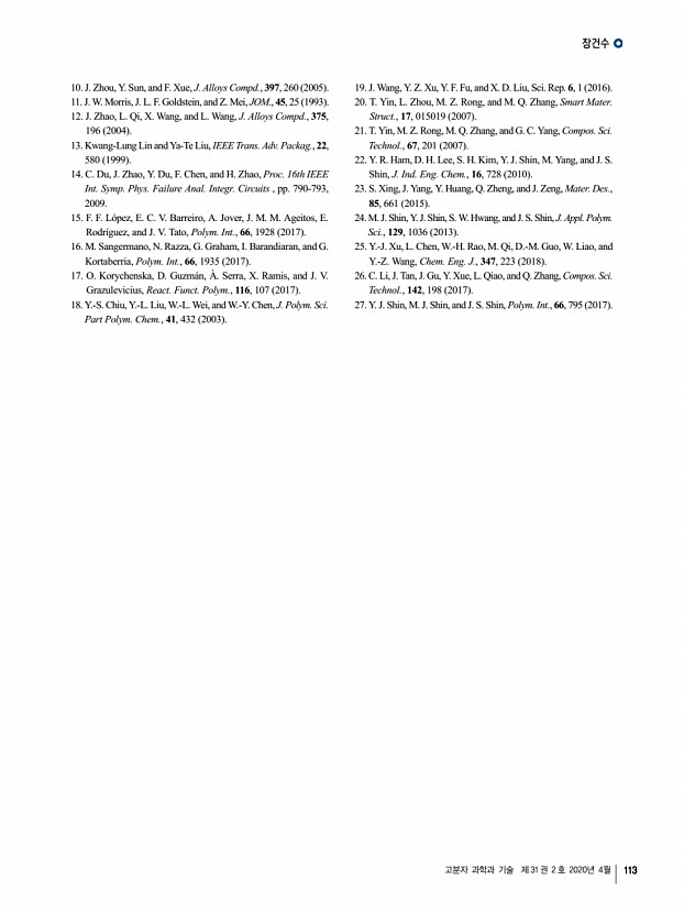 장건수 고분자 과학과 기술 제 31 권 2 호 2020년 4월 113 10. J. Zhou, Y. Sun, and F. Xue, J. Alloys Compd., 397, 260 2005 11. J. W. Morris, J. L. F. Goldstein, and Z. Mei, JOM., 45, 25 1993 12. J. Zhao, L. Qi, X. Wang, and L. Wang, J. Alloys Compd., 375, 196 2004 13. Kwang-Lung Lin and Ya-Te Liu, IEEE Trans. Adv. Packag., 22, 580 1999 14. C. Du, J. Zhao, Y. Du, F. Chen, and H. Zhao, Proc. 16th IEEE Int. Symp. Phys. Failure Anal. Integr. Circuits , pp. 790-793, 2009. 15. F. F. López, E. C. V. Barreiro, A. Jover, J. M. M. Ageitos, E. Rodríguez, and J. V. Tato, Polym. Int., 66, 1928 2017 16. M. Sangermano, N. Razza, G. Graham, I. Barandiaran, and G. Kortaberria, Polym. Int., 66, 1935 2017 17. O. Korychenska, D. Guzmán, À. Serra, X. Ramis, and J. V. Grazulevicius, React. Funct. Polym., 116, 107 2017 18. Y.-S. Chiu, Y.-L. Liu, W.-L. Wei, and W.-Y. Chen, J. Polym. Sci. Part Polym. Chem., 41, 432 2003 19. J. Wang, Y. Z. Xu, Y. F. Fu, and X. D. Liu, Sci. Rep. 6, 1 2016 20. T....