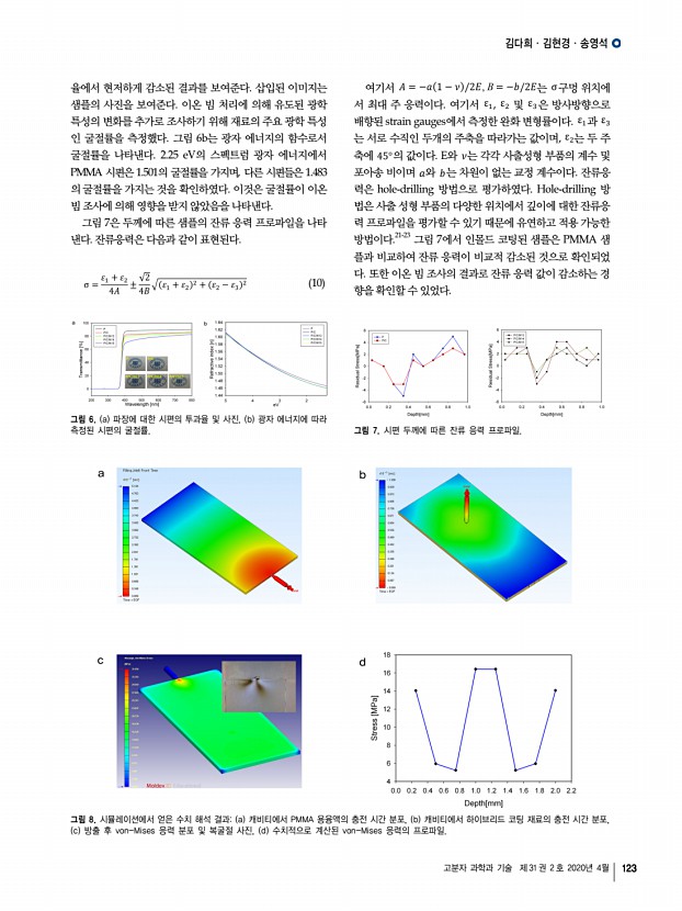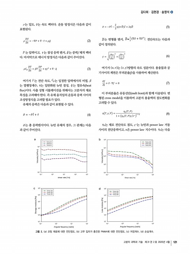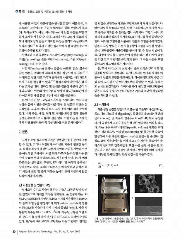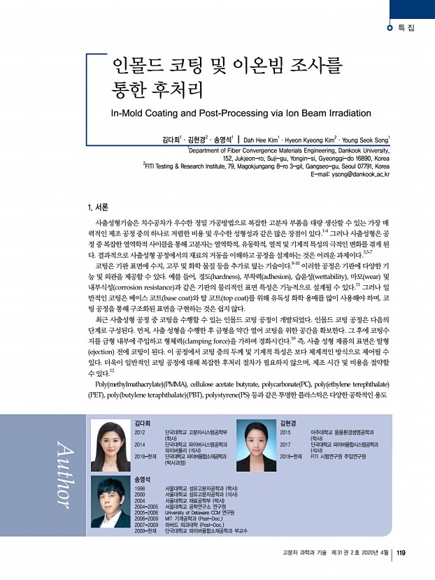 특 집 고분자 과학과 기술 제 31 권 2 호 2020년 4월 119 인몰드 코팅 및 이온빔 조사를 통한 후처리 In-Mold Coating and Post-Processing via Ion Beam Irradiation 김다희1ㆍ김현경2ㆍ송영석1 | Dah Hee Kim1ㆍHyeon Kyeong Kim2ㆍYoung Seok Song1 1 Department of Fiber Convergence Materials Engineering, Dankook University, 152, Jukjeon-ro, Suji-gu, Yongin-si, Gyeonggi-do 16890, Korea 2FITI Testing & Research Institute, 79, Magokjungang 8-ro 3-gil, Gangseo-gu, Seoul 07791, Korea E-mailysong@dankook.ac.kr 김다희 2012 단국대학교 고분자시스템공학부 학사 2014 단국대학교 파이버시스템공학과 파이버물리 석사 2018-현재 단국대학교 파이버융합소재공학과 박사과정 김현경 2015 아주대학교 응용환경생명공학과 학사 2017 단국대학교 파이버융합시스템공학과 석사 2018-현재 FITI 시험연구원 주임연구원 송영석 1998 서울대학교 섬유고분자공학과 학사 2000 서...