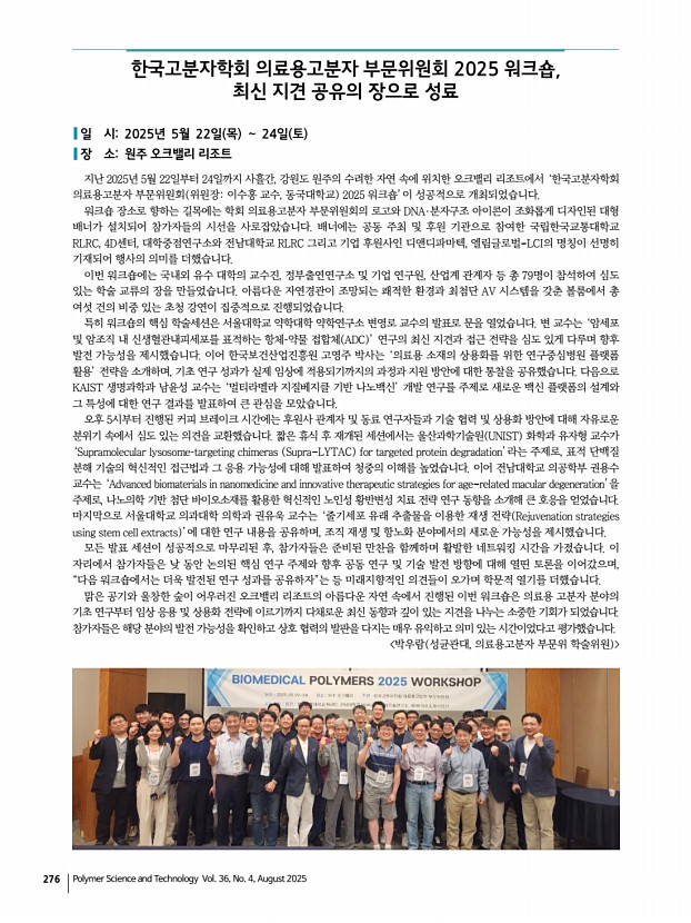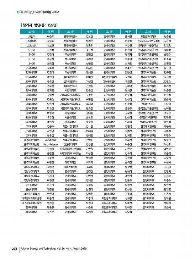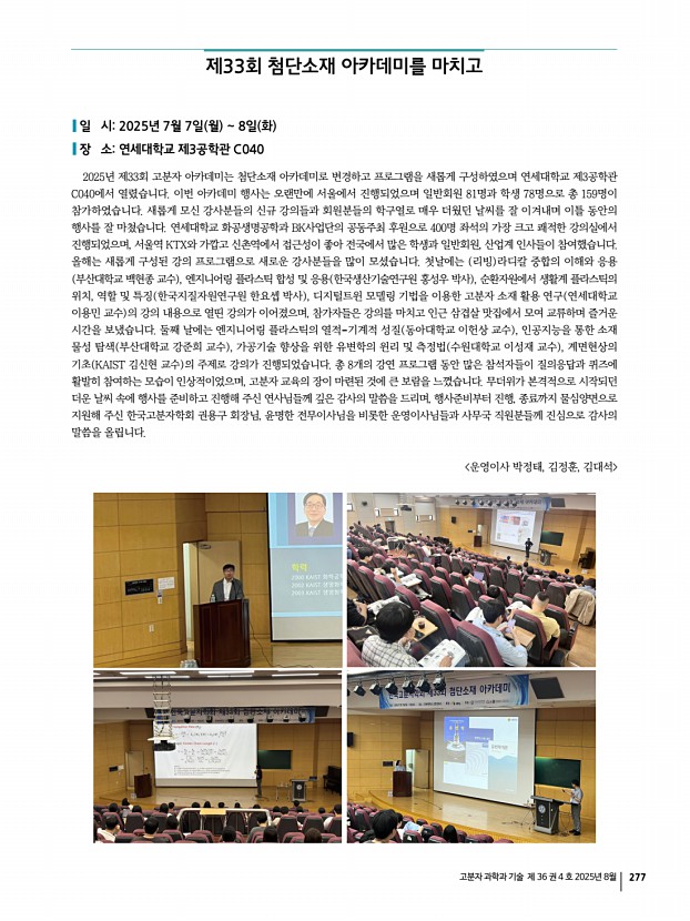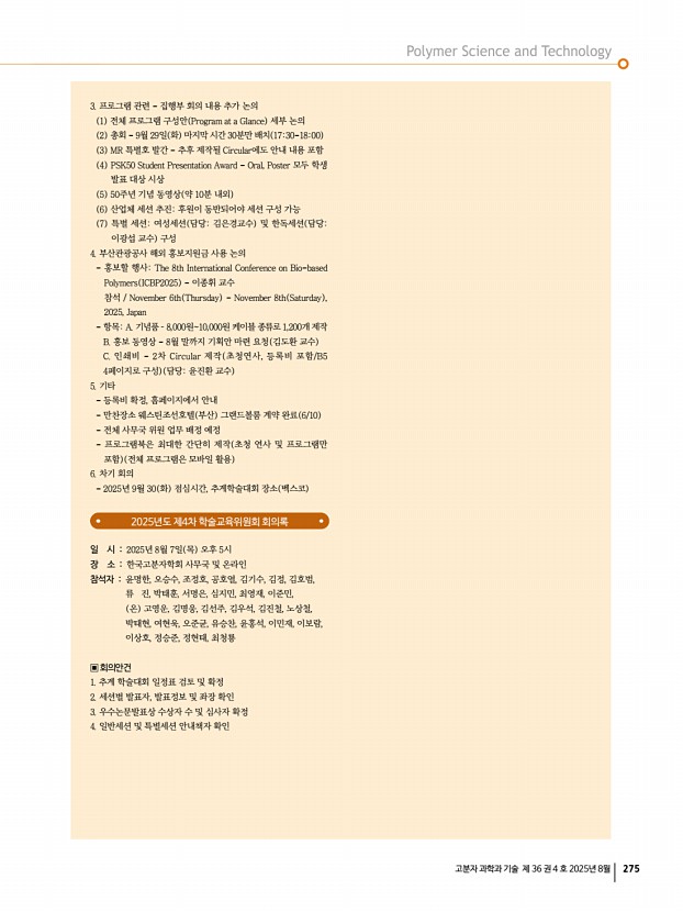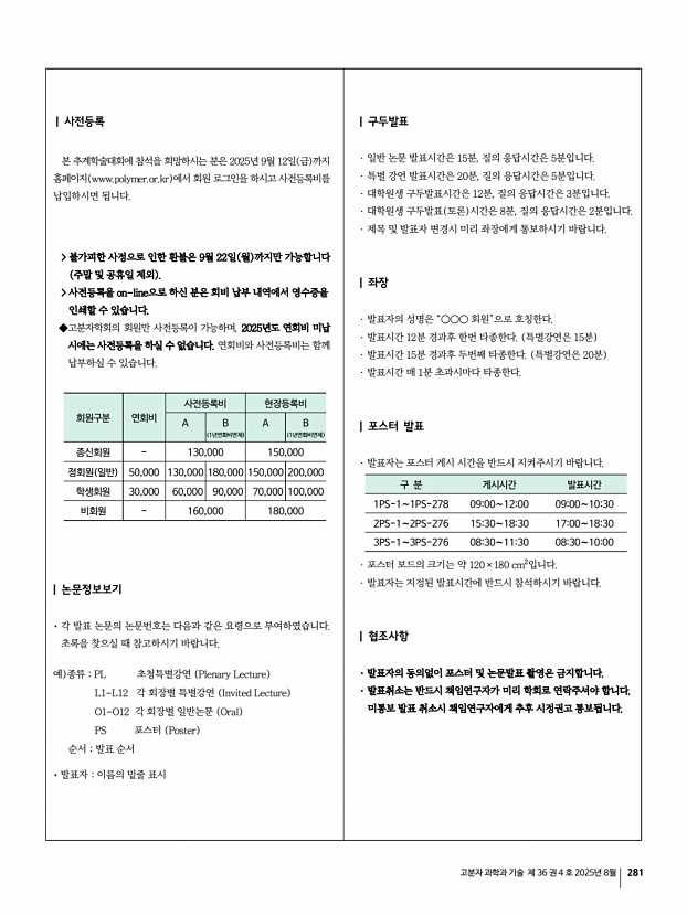 고분자 과학과 기술 제 36 권 4 호 2025년 8월 281 | 사전등록 본 추계학술대회에 참석을 희망하시는 분은 2025년 9월 12일 금 까지 홈페이지 www.polymer.or.kr 에서 회원 로그인을 하시고 사전등록비를 납입하시면 됩니다. 불가피한 사정으로 인한 환불은 9월 22일 월 까지만 가능합니다 주말 및 공휴일 제외 사전등록을 on-line으로 하신 분은 회비 납부 내역에서 영수증을 인쇄할 수 있습니다. ◆고분자학회의 회원만 사전등록이 가능하며, 2025년도 연회비 미납 시에는 사전등록을 하실 수 없습니다. 연회비와 사전등록비는 함께 납부하실 수 있습니다. 회원구분 연회비 사전등록비 현장등록비 A B 1년연회비면제 A B 1년연회비면제 종신회원 130,000 150,000 정회원 일반 50,000 130,000 180,000 150,000 200,000 학생회원 30,000 60,000 90,000 70,000 100,000 비회원 160,000 180,000 | 논문정보보기 ·...