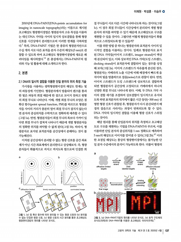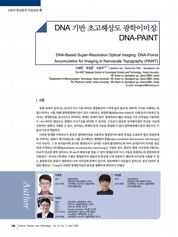 ...균관대학교 화학공학/고분자공학부 학사 2017-현재 고려대학교 KU-KIST 융합대학원 석박사통합과정 박성훈 2019 성균관대학교 화학공학/고분자공학부 학사 2019-현재 고려대학교 KU-KIST 융합대학원 석박사통합과정 이승우 2005 서강대학교 화학공학과 학사 2011 카이스트 생명화학공학과 박사 2012 카이스트 박사후 연구원 2014 Harvard University 박사후 연구원 2014-2018 성균관대학교 성균나노과학기술원, 나노공학과, 화학공학부 조교수 2019-현재 고려대학교 KU-KIST 융합대학원 부교수 DNA기반 초고해상도 광학이미징DNA-PAINT DNA-Based Super-Resolution Optical ImagingDNA-Points Accumulation for Imaging in Nanoscale Topography PAINT 이재원1ㆍ박성훈1ㆍ이승우1,2,3 | Jaewon LeeㆍSung Hun ParkㆍSeungwoo Lee 1 KU-KIST Graduate School of Converging Science and Technology, Korea University, 145 Anam-ro, Seongbuk-gu, Seoul 02841, Korea 2 Depart...