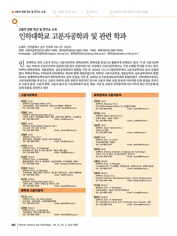 ..., 섬유공학과와의 통합을 거친 후, 2014년 나노시스템공학부에서 고분자공학과로 분리 독립하 였다. 화학공학과는 1954년에 인하대학교 개교와 함께 개설되었으며, 1999년 고분자공학과, 생물공학과, 섬유공학과와의 통합, 2014년 생명화학공학부에서 화학공학과로 분리 독립을 거친 후, 2018년 유기응용재료공학과와 통합하였다. 인하대학교에서는 고분자공학과를 중심으로 고분자 과학과 공학 전반의 학문적인 연구와 고분자 관련 산업 발전에 이바지할 인재 양성을 목적으 로 고분자 합성, 고분자 화학, 고분자 물리 등 기초과목에서 물성, 재료, 가공 등 고분자 공학분야에 이르기까지 최근 연구동향 및 실제 응용을 강의하고 있다. 고분자공학과 화학공학과 고분자분야 최형진 교수 ·공학박사 Carnegie Mellon Univ. ·고분자유변학, 전자기유변유체, 고분자나노...