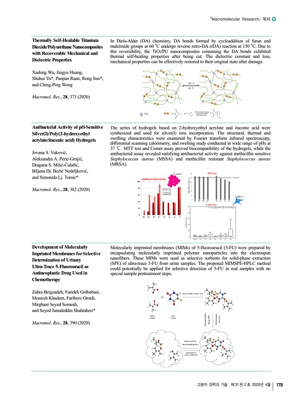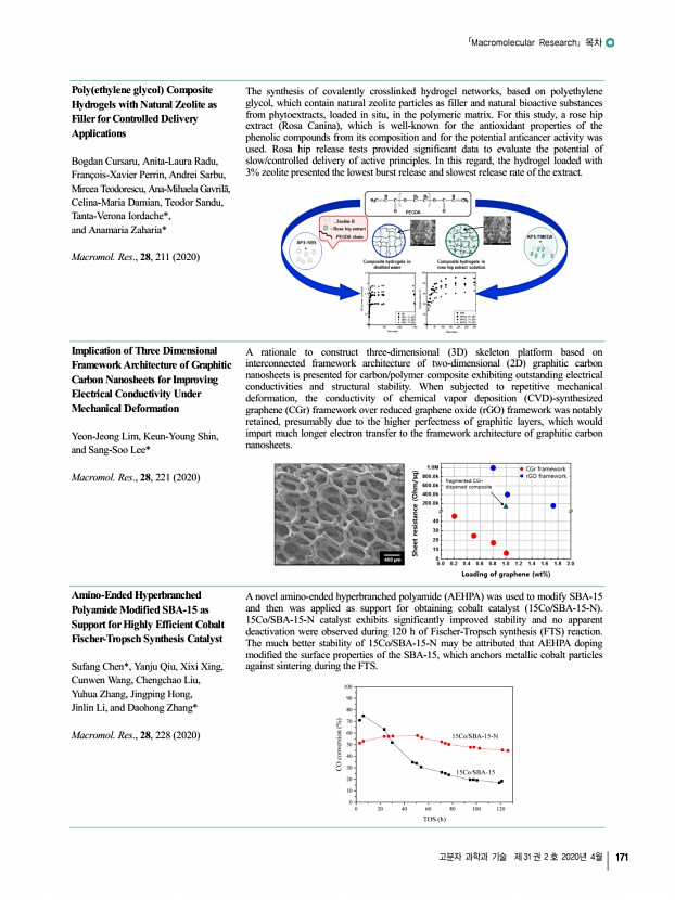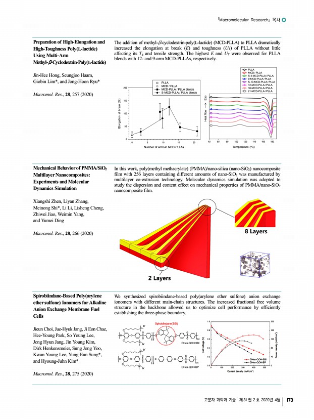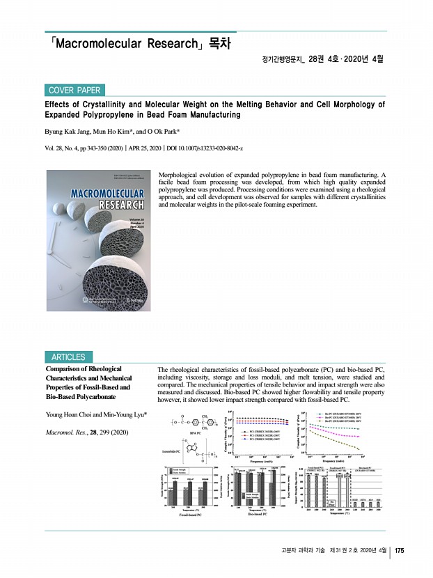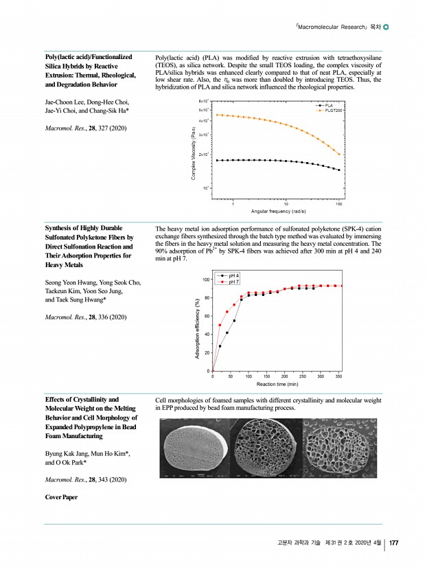 「Macromolecular Research」 목차 고분자 과학과 기술 제 31 권 2 호 2020년 4월 177 Poly lactic acid /Functionalized Silica Hybrids by Reactive ExtrusionThermal, Rheological, and Degradation Behavior Jae-Choon Lee, Dong-Hee Choi, Jae-Yi Choi, and Chang-Sik Ha* Macromol. Res., 28, 327 2020 Poly lactic acid PLA was modified by reactive extrusion with tetraethoxysilane TEOS , as silica network. Despite the small TEOS loading, the complex viscosity of PLA/silica hybrids was enhanced clearly compared to that of neat PLA, especially at low shear rate. Also, the η0 was more than doubled by introducing TEOS. Thus, the hybridization of PLA and silica network influenced the rheological properties. Synthesis of Highly Durable Sulfonated Polyketone Fibers by Direct Sulfonation Reaction and Their Adsorption Properties for Heavy Metals Seong Yeon Hwang, Yong Seok Cho, Taekeun Kim, Yoon Seo Jung, and Taek Sung Hwang* Macromol. Res., 28, 336 2020 The heavy metal ion adsorption performan...