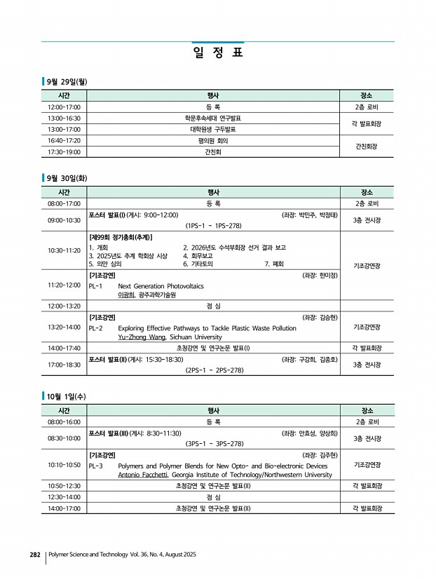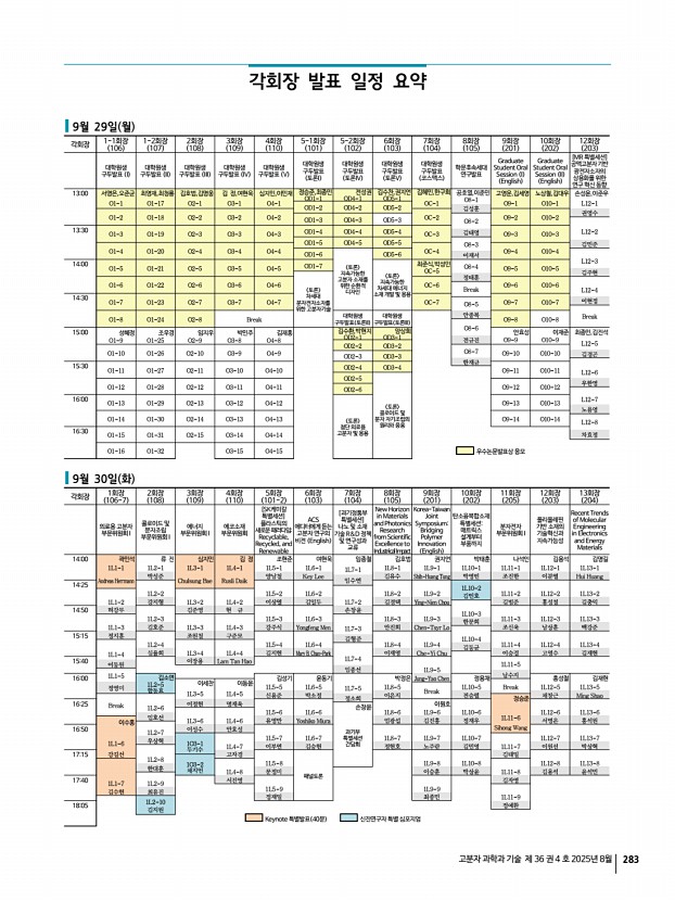 고분자 과학과 기술 제 36 권 4 호 2025년 8월 283 각회장 발표 일정 요약 9월 29일 월 각회장 1-1회장 106 1-2회장 107 2회장 108 3회장 109 4회장 110 5-1회장 101 5-2회장 102 6회장 103 7회장 104 8회장 105 9회장 201 10회장 202 12회장 203 대학원생 구두발표 I 대학원생 구두발표 II 대학원생 구두발표 III 대학원생 구두발표 IV 대학원생 구두발표 V 대학원생 구두발표 토론I 대학원생 구두발표 토론IV 대학원생 구두발표 토론V 대학원생 구두발표 코스맥스 학문후속세대 연구발표 Graduate Student Oral Session I English Graduate Student Oral Session II English [MR 특별세션] 공액고분자기반 광전자소자의 상용화를 위한 연구 혁신 동향 1300 서명은,오준균 최영재,최청룡 김호범,김명웅 김 정,여현욱 심지민,이민재 정승준,최종민 OD1-1 전성권 OD4-1 김수찬,권지언 OD5-1 김혜민,한구희 공호열,이준민 O8-1 ...