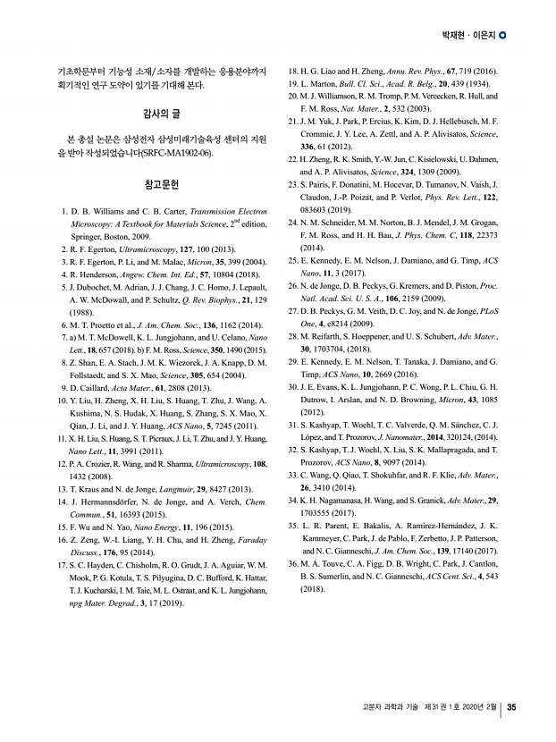 박재현ㆍ이은지 고분자 과학과 기술 제 31 권 1 호 2020년 2월 35 기초학문부터 기능성 소재/소자를 개발하는 응용분야까지 획기적인 연구 도약이 있기를 기대해 본다. 감사의 글 본 총설 논문은 삼성전자 삼성미래기술육성 센터의 지원 을 받아 작성되었습니다 SRFC-MA1902-06 참고문헌 1. D. B. Williams and C. B. Carter, Transmission Electron MicroscopyA Textbook for Materials Science, 2nd edition, Springer, Boston, 2009. 2. R. F. Egerton, Ultramicroscopy, 127, 100 2013 3. R. F. Egerton, P. Li, and M. Malac, Micron, 35, 399 2004 4. R. Henderson, Angew. Chem. Int. Ed., 57, 10804 2018 5. J. Dubochet, M. Adrian, J. J. Chang, J. C. Homo, J. Lepault, A. W. McDowall, and P. Schultz, Q. Rev. Biophys., 21, 129 1988 6. M. T. Proetto et al., J. Am. Chem. Soc., 136, 1162 2014 7. a M. T. McDowell, K. L. Jungjohann, and U. Celano, Nano Lett., 18, 657 2018 b F. M. Ross, Science, 350, 1490 2015 8. Z. Shan, E. A. Stach, ...