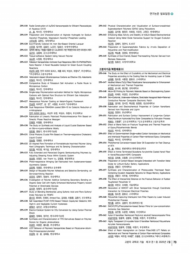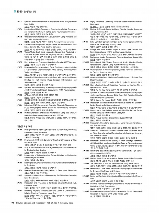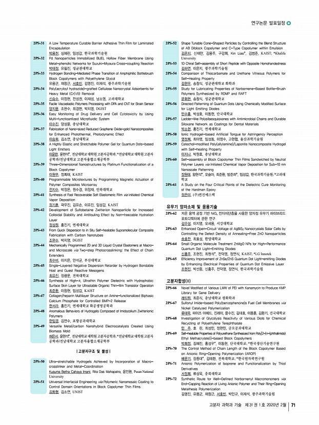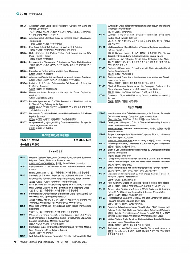 ...k Chemistry 김혜원, 이현종*, 강성민, 김지영, 함정우, 지유진, 고원건, 연세대학교; *가천 대학교 1PS-266 Interaction of Protein with a Modified Drug Conjugate 나행요, 손정선, 조선대학교 1PS-267 Adhesive and Tough Hydrogel Based on Mussel-Inspired Copolymer 나행요, 손정선, 최재곤, 방문수*, 조선대학교; *공주대학교 1PS-268 Inhibition of LDH5 Using Self-Assembly Cell Penetrating Polypeptide for Cancer Treatment 남호연, 김유천, 한국과학기술원 1PS-269 Hyaluronate-based Terpolymeric Hydrogel for Tissue Engineering Applications 노인섭, 서울과학기술대학교 1PS-270 Preocular Applicator with Dry Tablet Formulation of PLGA Nanoparticles for Topical Drug Delivery to the Eye 류우미, 김세나*, 민창희, 최영빈**, 서울대학교; *서울대학교 의생명연구원; **서울대학교 의과대학 1PS-271 Mechanically Controllable PEG-Acrylated Hydrogel beads for Solid-Phase Peptide Synthesis 김성수, 이상...
