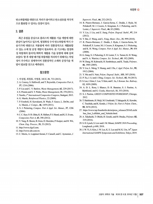 이진우 고분자 과학과 기술 제 30 권 6 호 2019년 12월 507 탄소복합재를 대량으로 처리가 용이하고 탄소섬유를 적극적 으로 활용할 수 있다는 장점이 있다. 3. 결론 최근 유럽을 중심으로 플라스틱 재활용 기술 개발에 대한 관심이 높아지고 있으며, 열경화성 수지 탄소복합재 역시 수 송기기에 대량으로 적용됨에 따라 친환경적으로 재활용할 수 있는 소재 및 공정 개발이 필요하다. 본 기고에는 열경화 성 복합재의 물리적/화학적 재활용 기술 동향에 대해 살펴 보았다. 향 후 대량 폐기될 복합재를 처리하기 위해서는 작업 성이 우수하고 경제적이며 친환경적인 소재와 공정기술 개 발이 필요할 것으로 예측된다. 참고문헌 1. 마성원, 최창휴, 서영종, NICE, 31, 733 2013 2. A. Conroy, S. Halliwell, and T. Reynolds, Composites Part A, 37, 1216 2006 3. P. Liu and C. Y. Barlow, Waste Management, ...