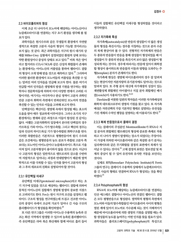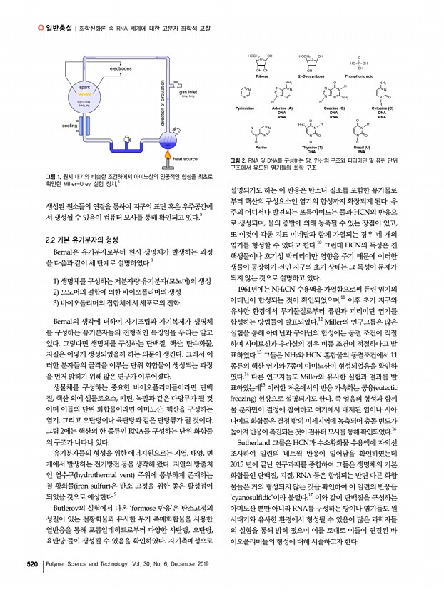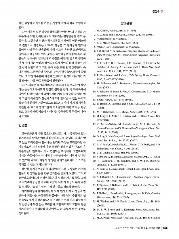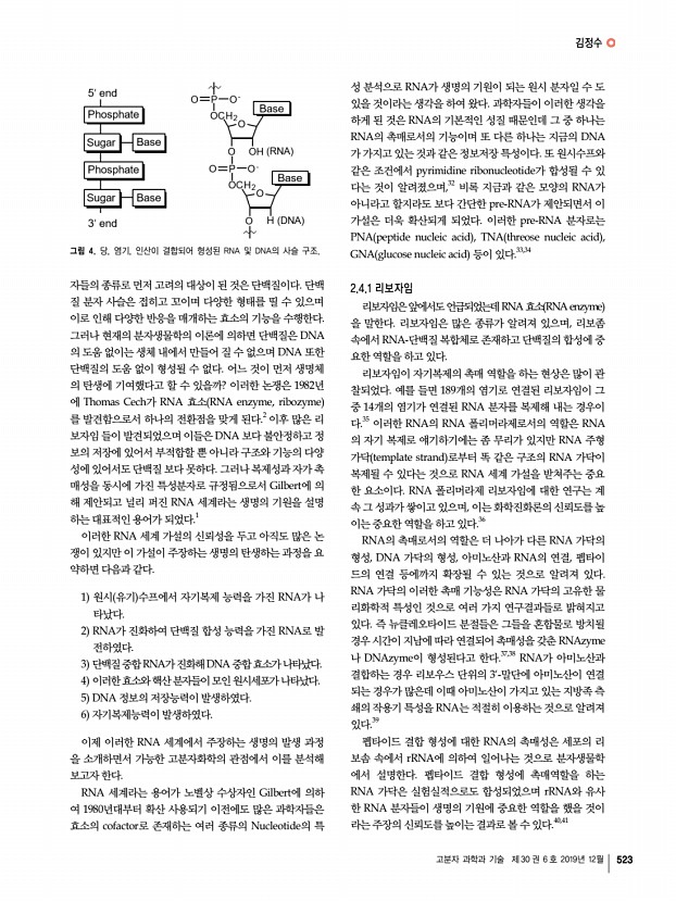 김정수 고분자 과학과 기술 제 30 권 6 호 2019년 12월 523 그림 4. 당, 염기, 인산이 결합되어 형성된 RNA 및 DNA의 사슬 구조. 자들의 종류로 먼저 고려의 대상이 된 것은 단백질이다. 단백 질 분자 사슬은 접히고 꼬이며 다양한 형태를 띨 수 있으며 이로 인해 다양한 반응을 매개하는 효소의 기능을 수행한다. 그러나 현재의 분자생물학의 이론에 의하면 단백질은 DNA 의 도움 없이는 생체 내에서 만들어 질 수 없으며 DNA 또한 단백질의 도움 없이 형성될 수 없다. 어느 것이 먼저 생명체 의 탄생에 기여했다고 할 수 있을까? 이러한 논쟁은 1982년 에 Thomas Cech가 RNA 효소 RNA enzyme, ribozyme 를 발견함으로서 하나의 전환점을 맞게 된다.2 이후 많은 리 보자임 들이 발견되었으며 이들은 DNA 보다 불안정하고 정 보의 저장에 있어서 부적합할 뿐 아니라 구조와 기능의 다양 ...