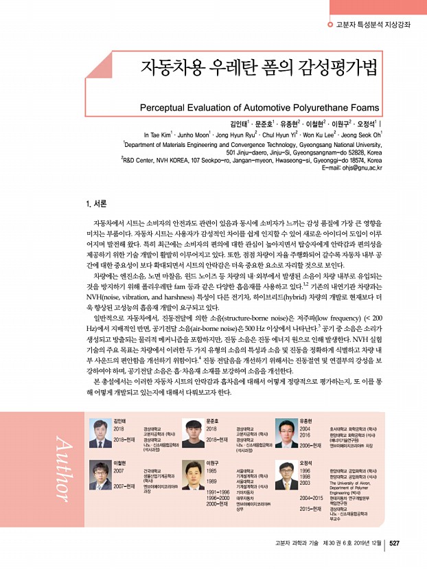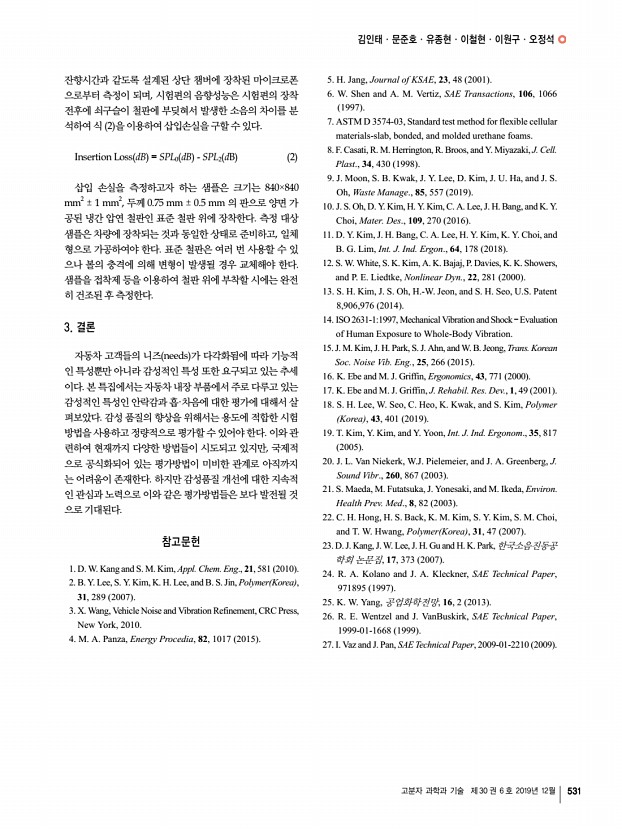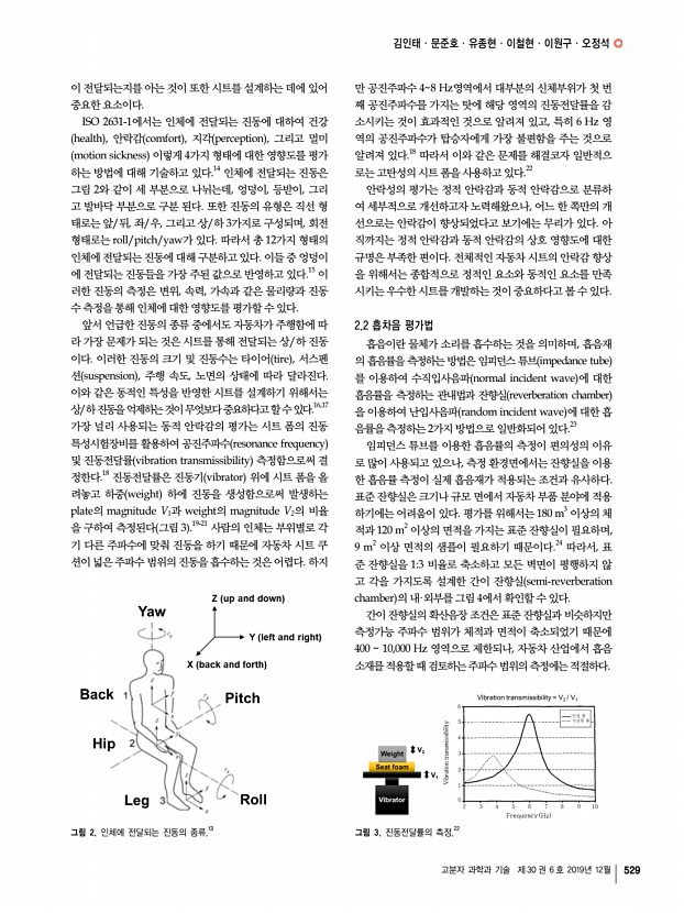 김인태ㆍ문준호ㆍ유종현ㆍ이철현ㆍ이원구ㆍ오정석 고분자 과학과 기술 제 30 권 6 호 2019년 12월 529 그림 2. 인체에 전달되는 진동의 종류.13 그림 3. 진동전달률의 측정.22 이 전달되는지를 아는 것이 또한 시트를 설계하는 데에 있어 중요한 요소이다. ISO 2631-1에서는 인체에 전달되는 진동에 대하여 건강 health , 안락감 comfort , 지각 perception , 그리고 멀미 motion sickness 이렇게 4가지 형태에 대한 영향도를 평가 하는 방법에 대해 기술하고 있다.14 인체에 전달되는 진동은 그림 2와 같이 세 부분으로 나뉘는데, 엉덩이, 등받이, 그리 고 발바닥 부분으로 구분 된다. 또한 진동의 유형은 직선 형 태로는 앞/뒤, 좌/우, 그리고 상/하 3가지로 구성되며, 회전 형태로는 roll/pitch/yaw가 있다. 따라서 총 12가지 형태의 인체에 전달되는 진동에 대해 구분하고 있다. 이들 중 엉...