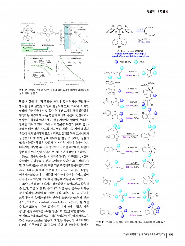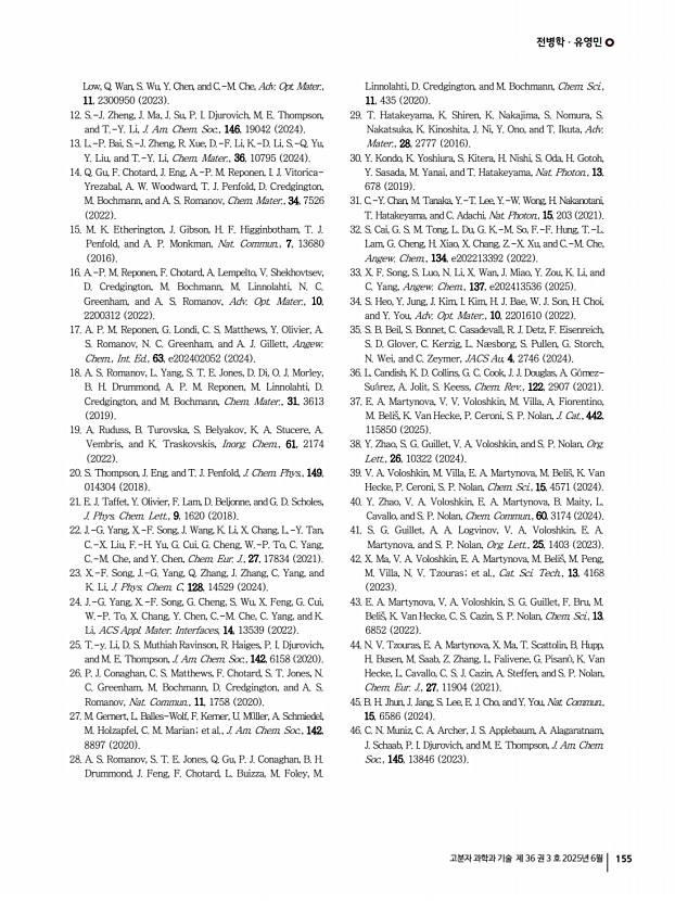 전병학ㆍ유영민 고분자 과학과 기술 제 36 권 3 호 2025년 6월 155 Low, Q. Wan, S. Wu, Y. Chen, and C.-M. Che, Adv. Opt. Mater., 11, 2300950 2023 12. S.-J. Zheng, J. Ma, J. Su, P. I. Djurovich, M. E. Thompson, and T.-Y. Li, J. Am. Chem. Soc., 146, 19042 2024 13. L.-P. Bai, S.-J. Zheng, R. Xue, D.-F. Li, K.-D. Li, S.-Q. Yu, Y. Liu, and T.-Y. Li, Chem. Mater., 36, 10795 2024 14. Q. Gu, F. Chotard, J. Eng, A.-P. M. Reponen, I. J. Vitorica- Yrezabal, A. W. Woodward, T. J. Penfold, D. Credgington, M. Bochmann, and A. S. Romanov, Chem. Mater., 34, 7526 2022 15. M. K. Etherington, J. Gibson, H. F. Higginbotham, T. J. Penfold, and A. P. Monkman, Nat. Commun., 7, 13680 2016 16. A.-P. M. Reponen, F. Chotard, A. Lempelto, V. Shekhovtsev, D. Credgington, M. Bochmann, M. Linnolahti, N. C. Greenham, and A. S. Romanov, Adv. Opt. Mater., 10, 2200312 2022 17. A. P. M. Reponen, G. Londi, C. S. Matthews, Y. Olivier, A. S. Romanov, N. C. Greenham, and A. J. Gillett, Angew. Chem., Int. Ed.,...